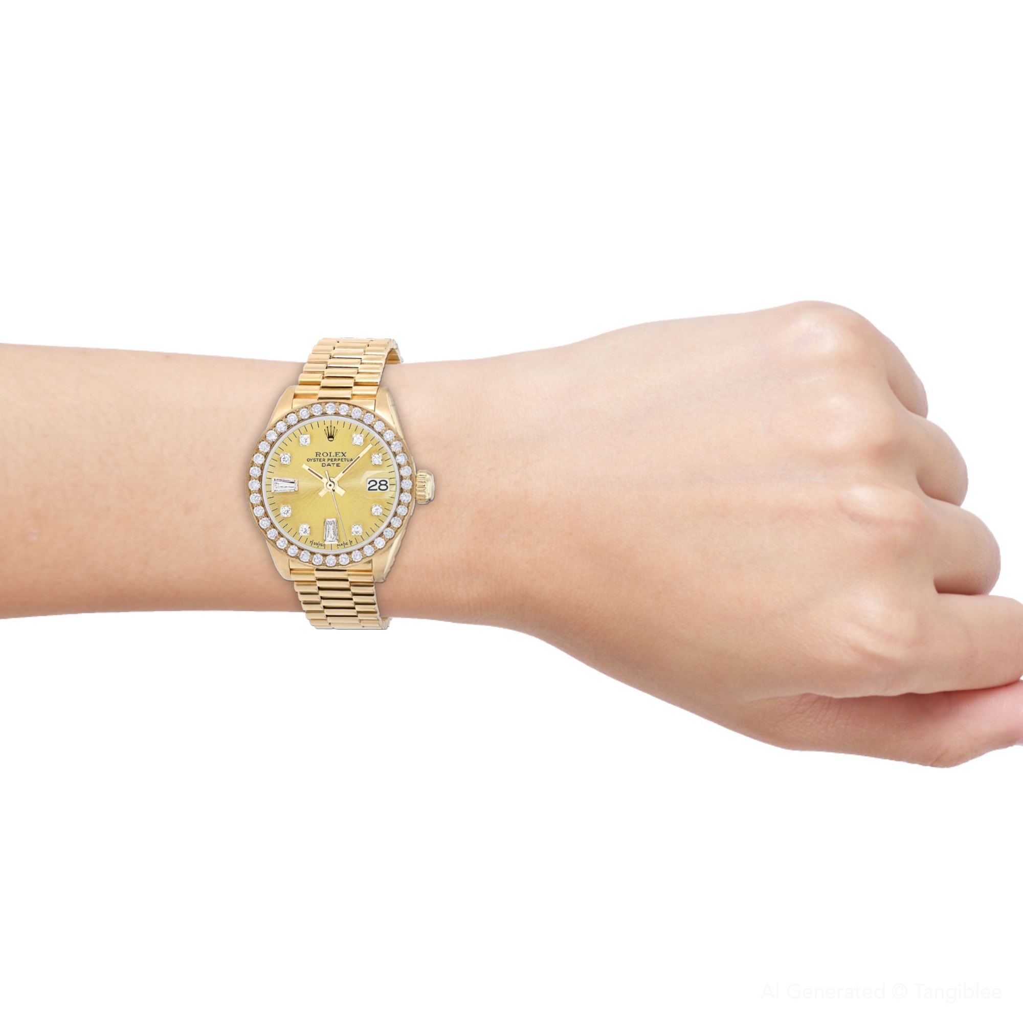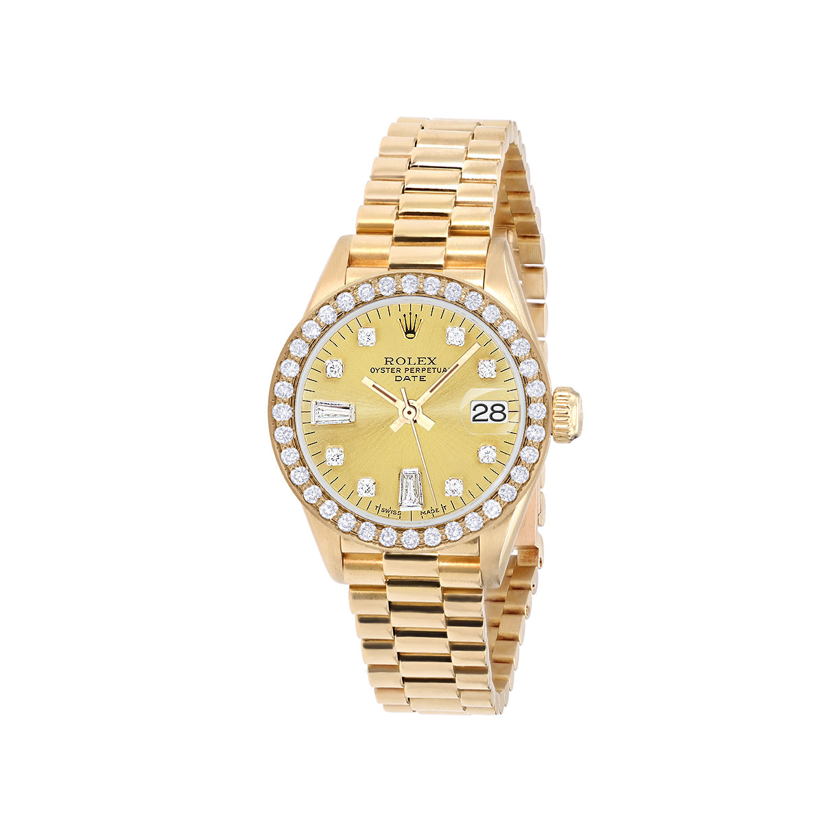 This Women's Rolex Datejust is a luxurious and stylish watch. It features a Yellow color scheme, adding sophistication to its design. The watch is made of 18k Gold, offering a premium feel. The case measures 26 mm. The case is crafted from 18k Gold. The bracelet is made of Yellow Gold It features a President style bracelet for a comfortable fit. The bezel is made of Yellow Gold and is set with Diamonds. The dial is Gold Tone, enhancing its visual appeal. Powered by an Automatic movement. Offered in Very Good condition, and comes with a seller's warranty of 60 months. Also available on custom order with additional options. These pre-owned Rolex watches are authentic Rolex watches with genuine diamonds, in excellent condition, they are checked for authenticity and basic water resistance. Watches will withstand an occasional rain just fine, but they are not diver's watches and should not be worn in shower or while swimming.
