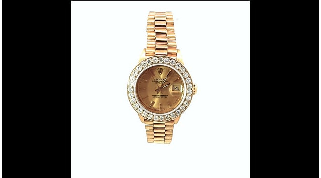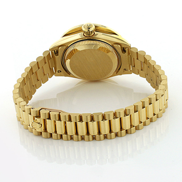 This Women's Small Rolex Oyster Perpetual Datejust. The watch is made of 18k Gold, offering a premium feel. The case measures 26 mm, It a President style bracelet for a comfortable fit. And is set with Diamonds. The dial is Gold Tone, and comes with a seller's warranty of months. Also available on custom order with additional options. These pre-owned Rolex watches are authentic Rolex watches with genuine diamonds, in excellent condition, they are checked for authenticity and basic water resistance. Watches will withstand an occasional rain just fine, but they are not diver's watches and should not be worn in shower or while swimming.