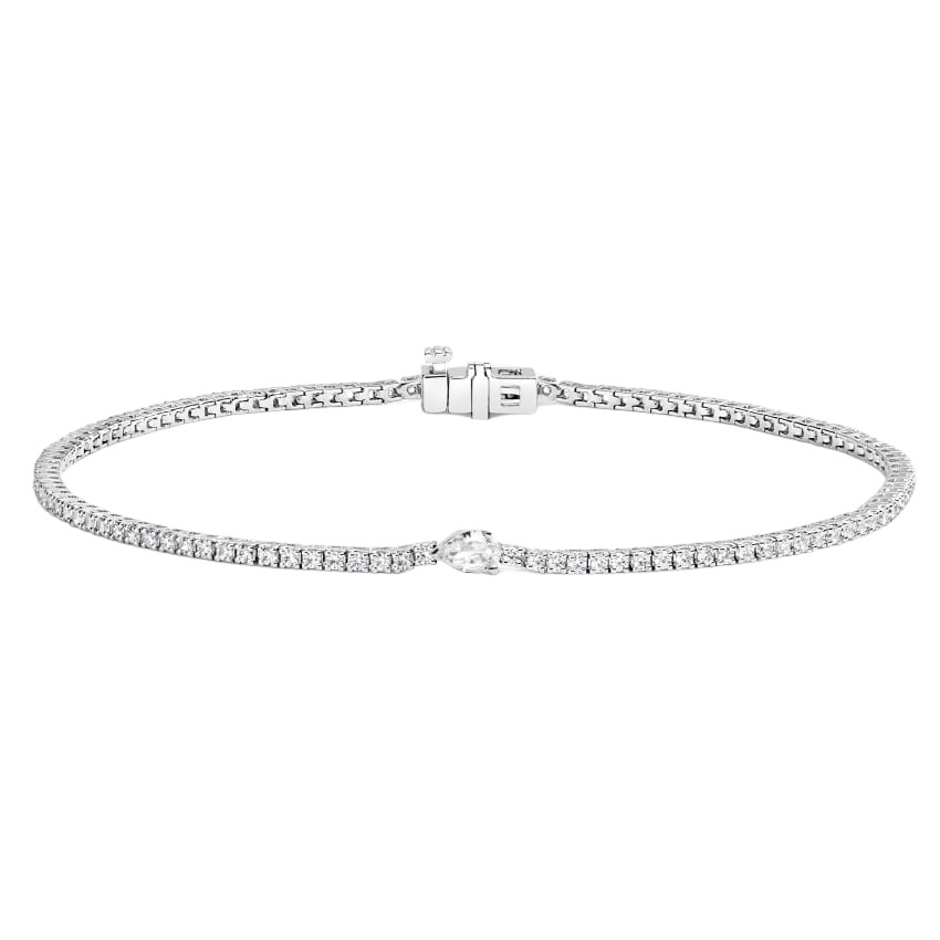This Women's Diamond Tennis bracelet is made from 18k Gold and is 2.5 mm wide and length inches. This Women's Diamond bracelet features 0.95 carats of White Diamonds, showcasing a chain and is available in 18k white gold, yellow gold and rose gold as well as 18k gold and platinum as a custom order.