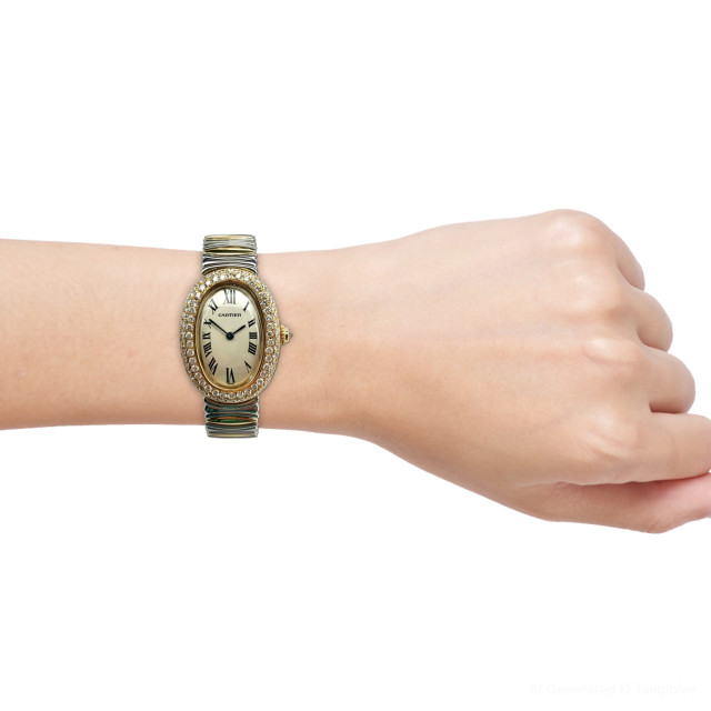 This Women's Two-Tone Cartier Baignoire is a luxurious and stylish watch. The watch is made of 18k Gold/Stainless Steel, offering a premium feel. The case measures 22 mm. The case is crafted from 18k Gold. The bracelet is made of Yellow Gold. The bezel is made of Gold and is set with White. The dial is Cream, enhancing its visual appeal. Powered by a Quartz movement. Offered in Good condition, and comes with a seller's warranty of 60 months. Also available on custom order with additional options. Please note this Cartier watch is pre-owned, in excellent condition, the diamonds are high quality, natural diamonds, set by our master craftsmen, watch box might show signs of wear (watch itself will be in perfect condition), comes with a 5 year warranty from ItsHot.