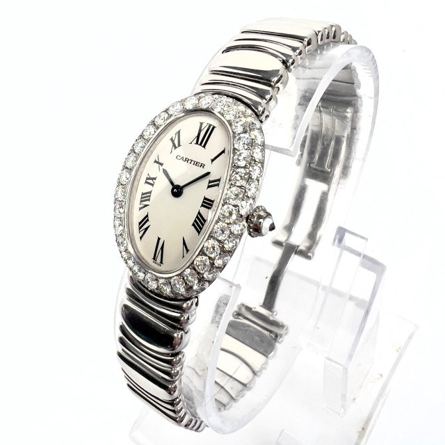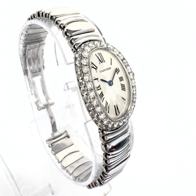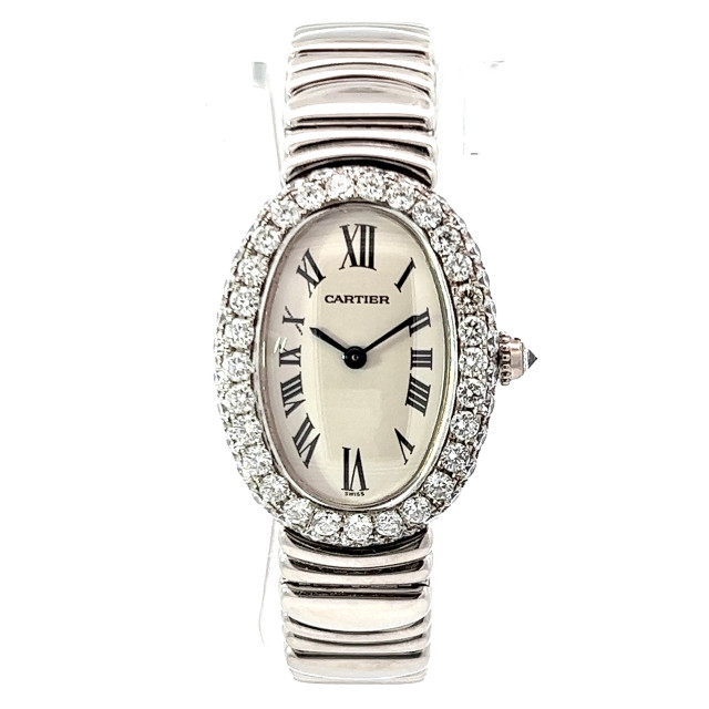 This Women's Cartier Baignoire is a luxurious and stylish watch. The watch is made of 18k Gold, offering a premium feel. The case measures 22 mm. The case is crafted from 18k Gold. The bracelet is made of White Gold. The bezel is made of Gold and is set with White. The dial is White, enhancing its visual appeal. Powered by a Swiss-Quartz movement. Offered in Good condition, and comes with a seller's warranty of 60 months. Also available on custom order with additional options.