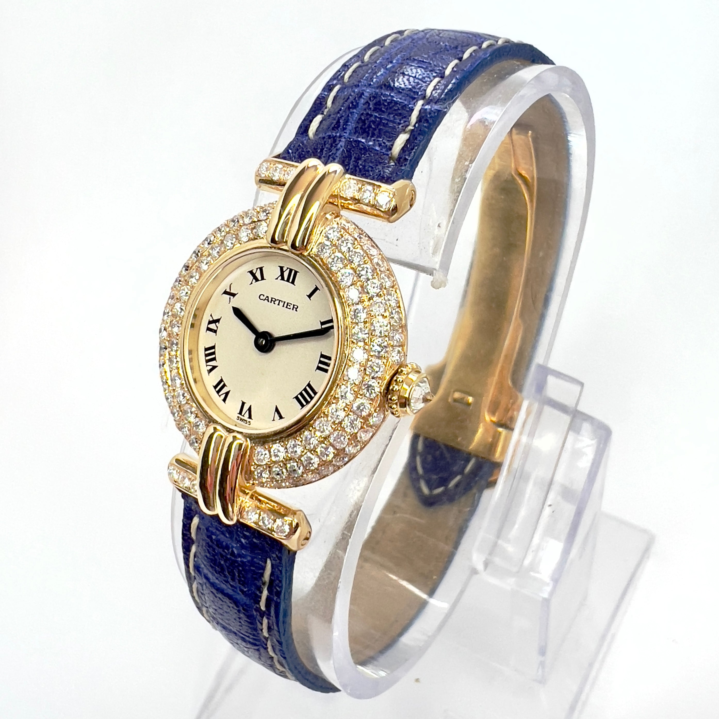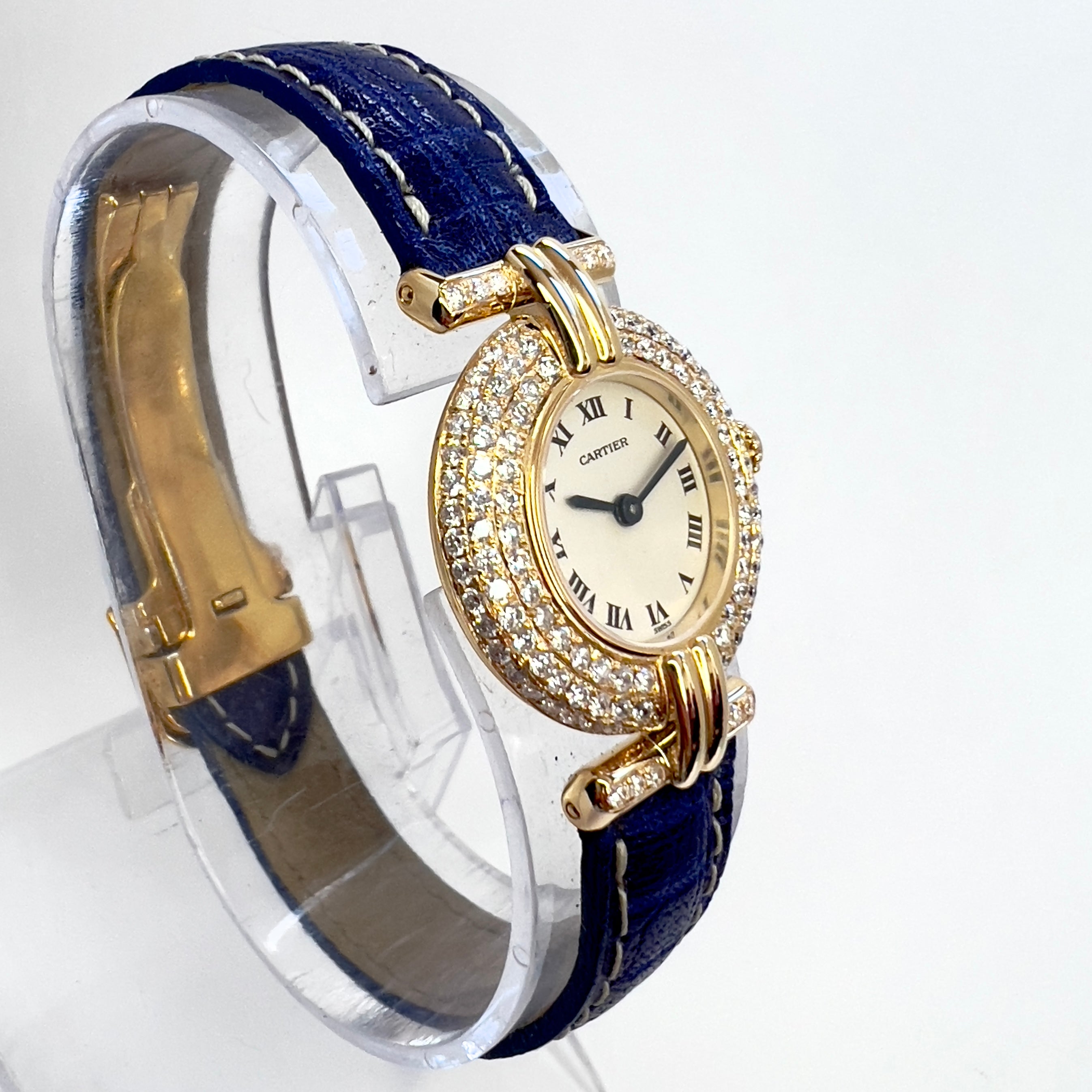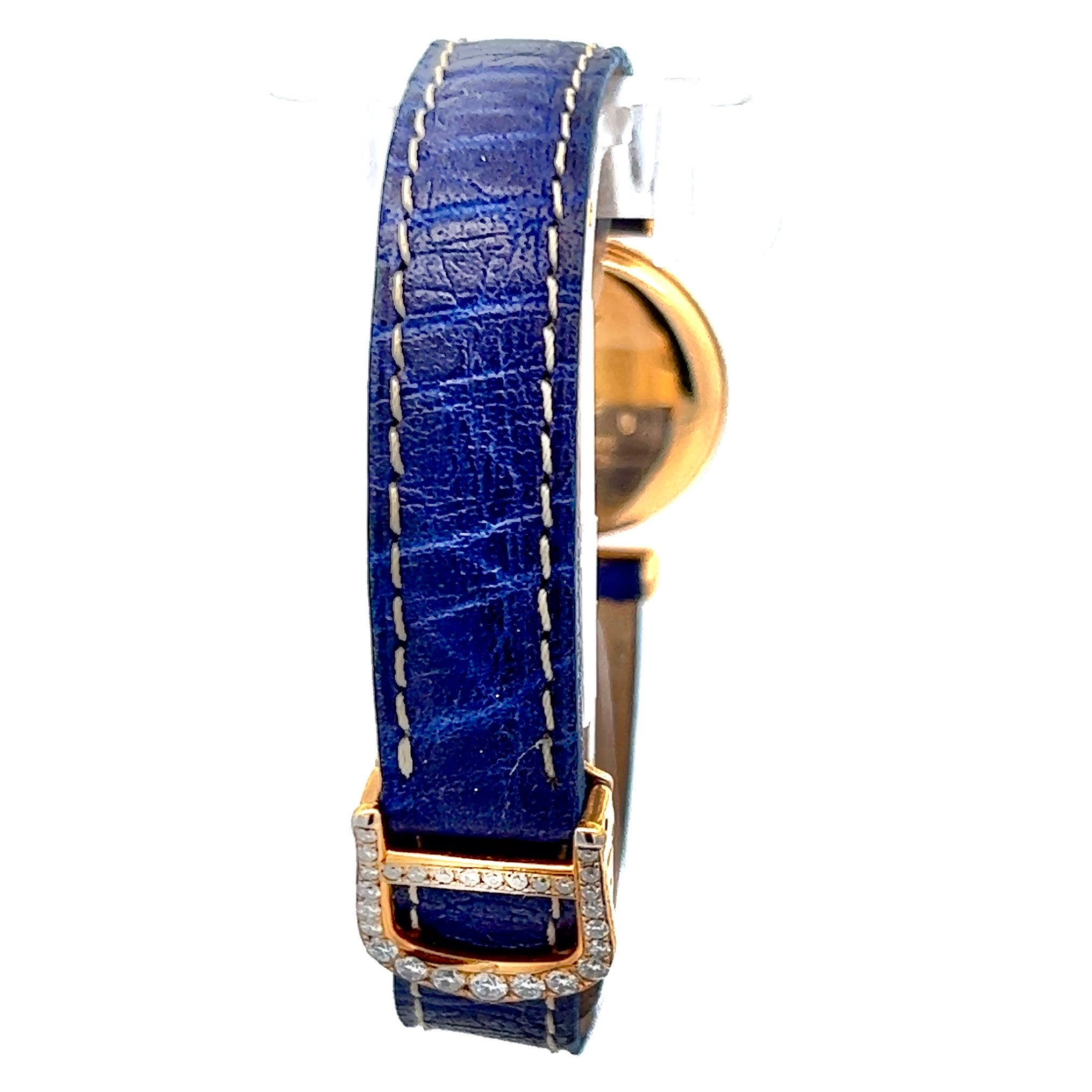 This Women's Cartier Colisee is a luxurious and stylish watch. The watch is made of 18k Gold, offering a premium feel. The case measures 24 mm. The case is crafted from 18k Gold. The bracelet is made of Blue Genuine Leather. The bezel is made of Gold and is set with White. The dial is White, enhancing its visual appeal. Powered by a Quartz movement. Offered in Good condition, and comes with a seller's warranty of 60 months. Also available on custom order with additional options.