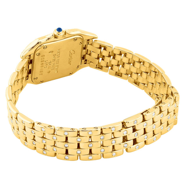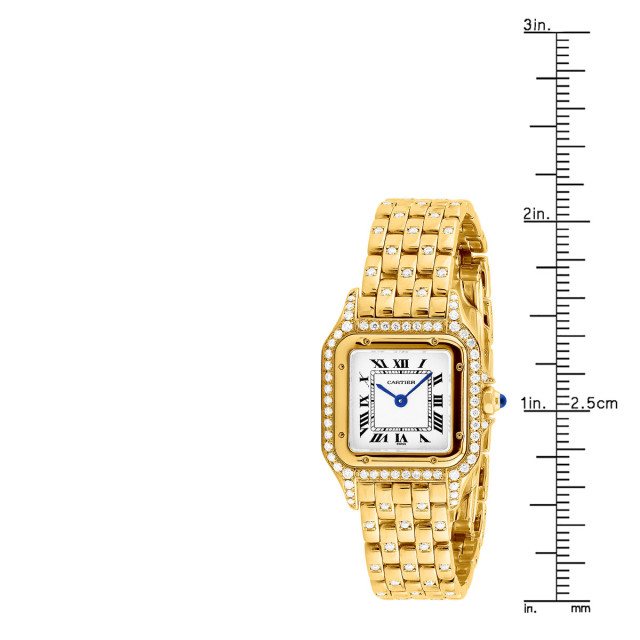 This Women's Cartier Panthere is a luxurious and stylish watch. The watch is made of 18k Gold, offering a premium feel. The case measures 23 mm. The case is crafted from 18k Gold. The bracelet is made of Yellow Gold. The bezel is made of Gold. The dial is Cream, enhancing its visual appeal. Powered by a Quartz movement. Offered in Good condition, and comes with a seller's warranty of 60 months. Also available on custom order with additional options. Please note this Cartier watch is pre-owned, in excellent condition, the diamonds are high quality, natural diamonds, set by our master craftsmen, watch box might show signs of wear (watch itself will be in perfect condition), comes with a 5 year warranty from ItsHot.