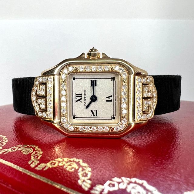 This Women's Cartier Panthere Art Deco is a luxurious and stylish watch. The watch is made of 18k Gold, offering a premium feel. The case measures 23 mm. The case is crafted from 18k Gold. The bracelet is made of Black Genuine Leather and is set with White. The dial is Silver, enhancing its visual appeal. Powered by a Quartz movement. Offered in Good condition, and comes with a seller's warranty of 60 months. Also available on custom order with additional options.