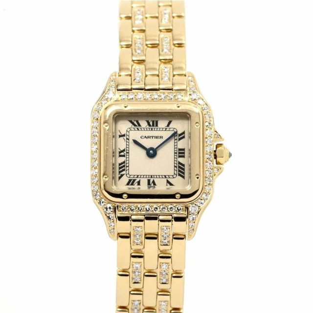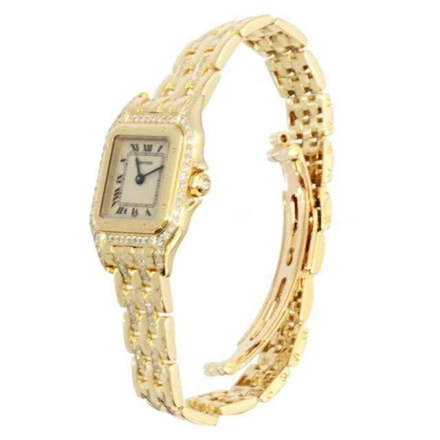 This Women's Cartier Panthere is a luxurious and stylish watch. The watch is made of 18k Gold, offering a premium feel. The case measures 23 mm. The case is crafted from 18k Gold. The case is adorned with Diamonds, enhancing its elegance. The bracelet is made of Yellow Gold and is set with Diamonds. The bezel is made of Yellow Gold. The dial is Cream, enhancing its visual appeal. Powered by a Quartz movement. Offered in Very Good condition, and comes with a seller's warranty of 60 months. Also available on custom order with additional options.