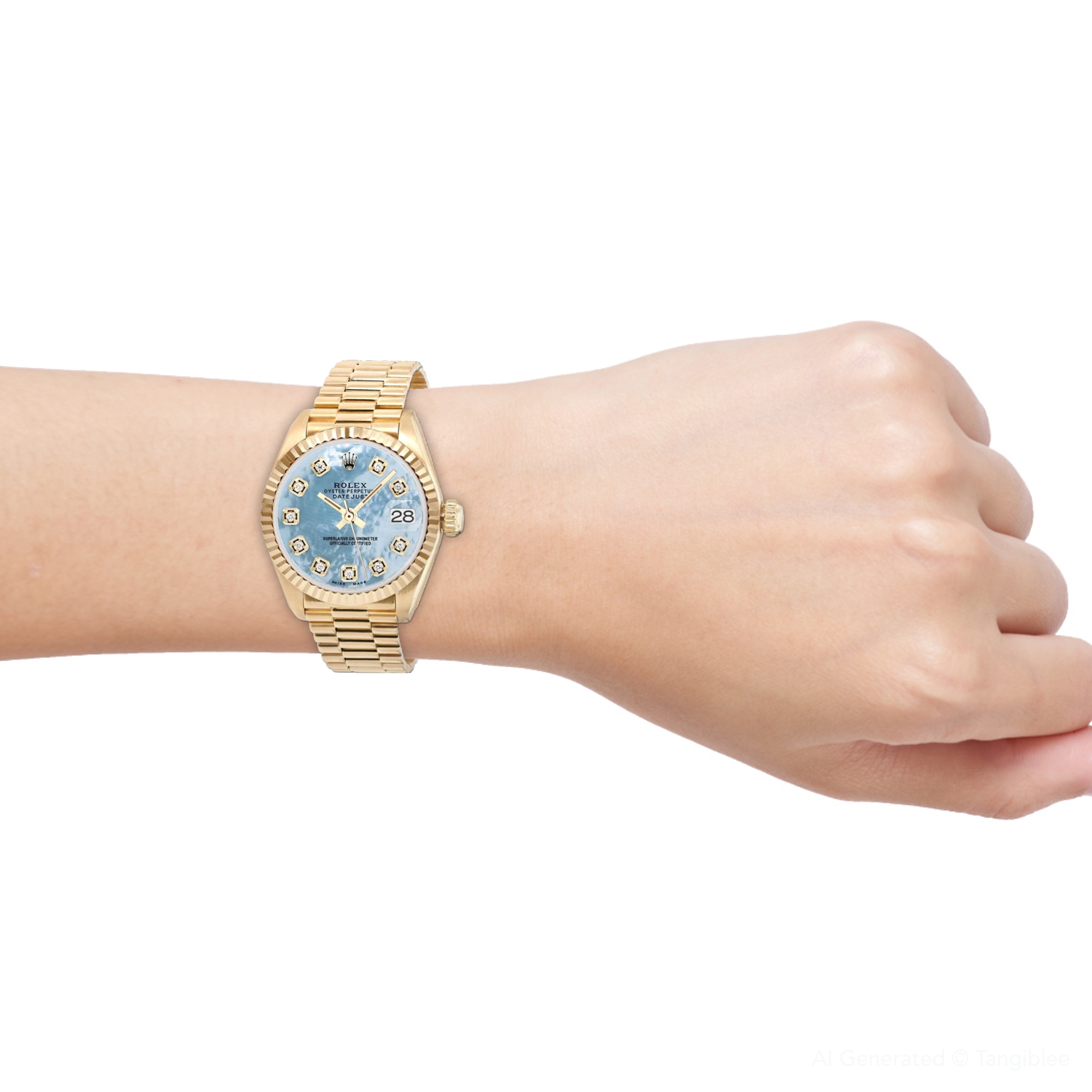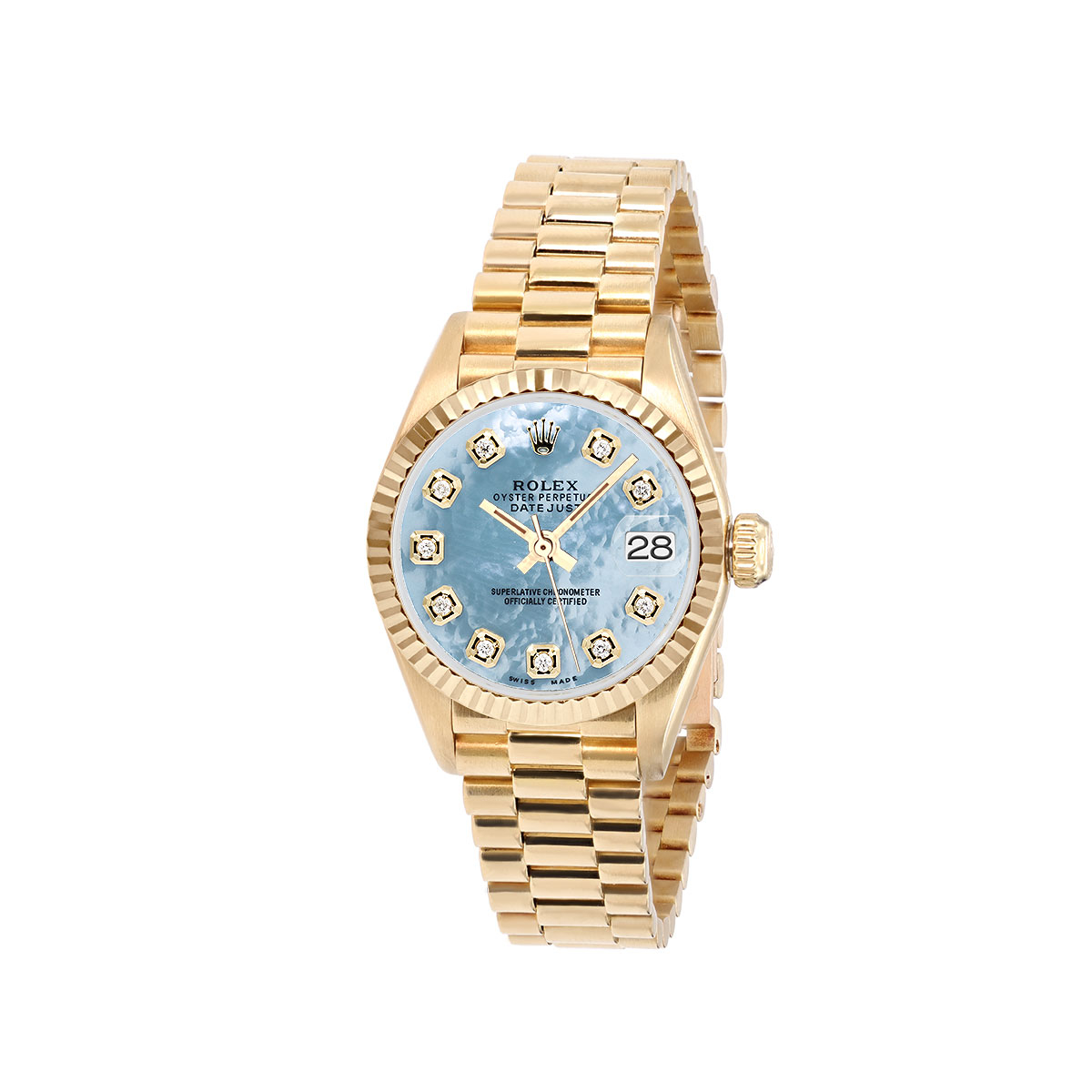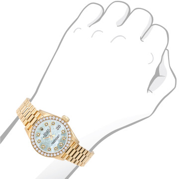 This Women's Rolex Datejust is a luxurious and stylish watch. It features a Yellow color scheme, adding sophistication to its design. The watch is made of 18k Gold, offering a premium feel. The case measures 26 mm. The case is crafted from 18k Gold. The bracelet is made of Yellow Gold It features a President style bracelet for a comfortable fit. The bezel is made of Gold. The dial is Blue, enhancing its visual appeal. Powered by an Automatic movement. Offered in Good condition, and comes with a seller's warranty of 60 months. Also available on custom order with additional options. These pre-owned Rolex watches are authentic Rolex watches with genuine diamonds, in excellent condition, they are checked for authenticity and basic water resistance. Watches will withstand an occasional rain just fine, but they are not diver's watches and should not be worn in shower or while swimming.