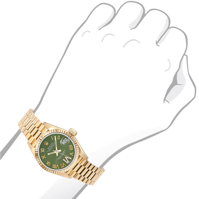 This Women's Rolex Datejust is a luxurious and stylish watch. It features a Yellow color scheme, adding sophistication to its design. The watch is made of 18k Gold, offering a premium feel. The case measures 26 mm. The case is crafted from 18k Gold. The bracelet is made of Yellow Gold It features a President style bracelet for a comfortable fit. The bezel is made of Yellow Gold. The dial is Green, enhancing its visual appeal. Powered by an Automatic movement. Offered in Very Good condition, and comes with a seller's warranty of 60 months. Also available on custom order with additional options. These pre-owned Rolex watches are authentic Rolex watches with genuine diamonds, in excellent condition, they are checked for authenticity and basic water resistance. Watches will withstand an occasional rain just fine, but they are not diver's watches and should not be worn in shower or while swimming.