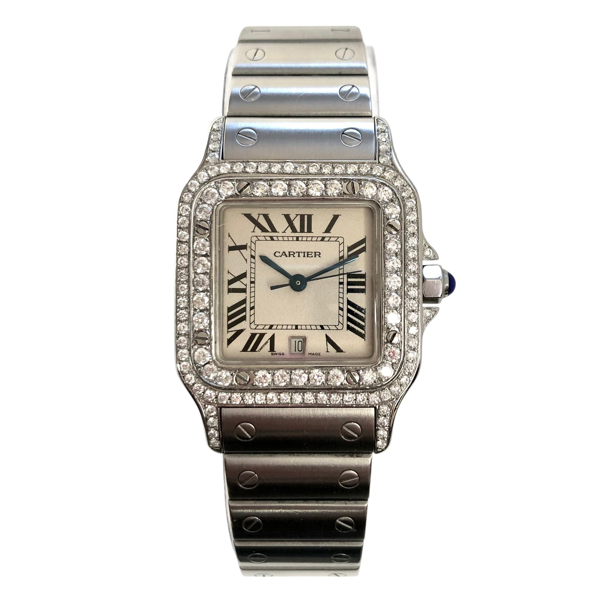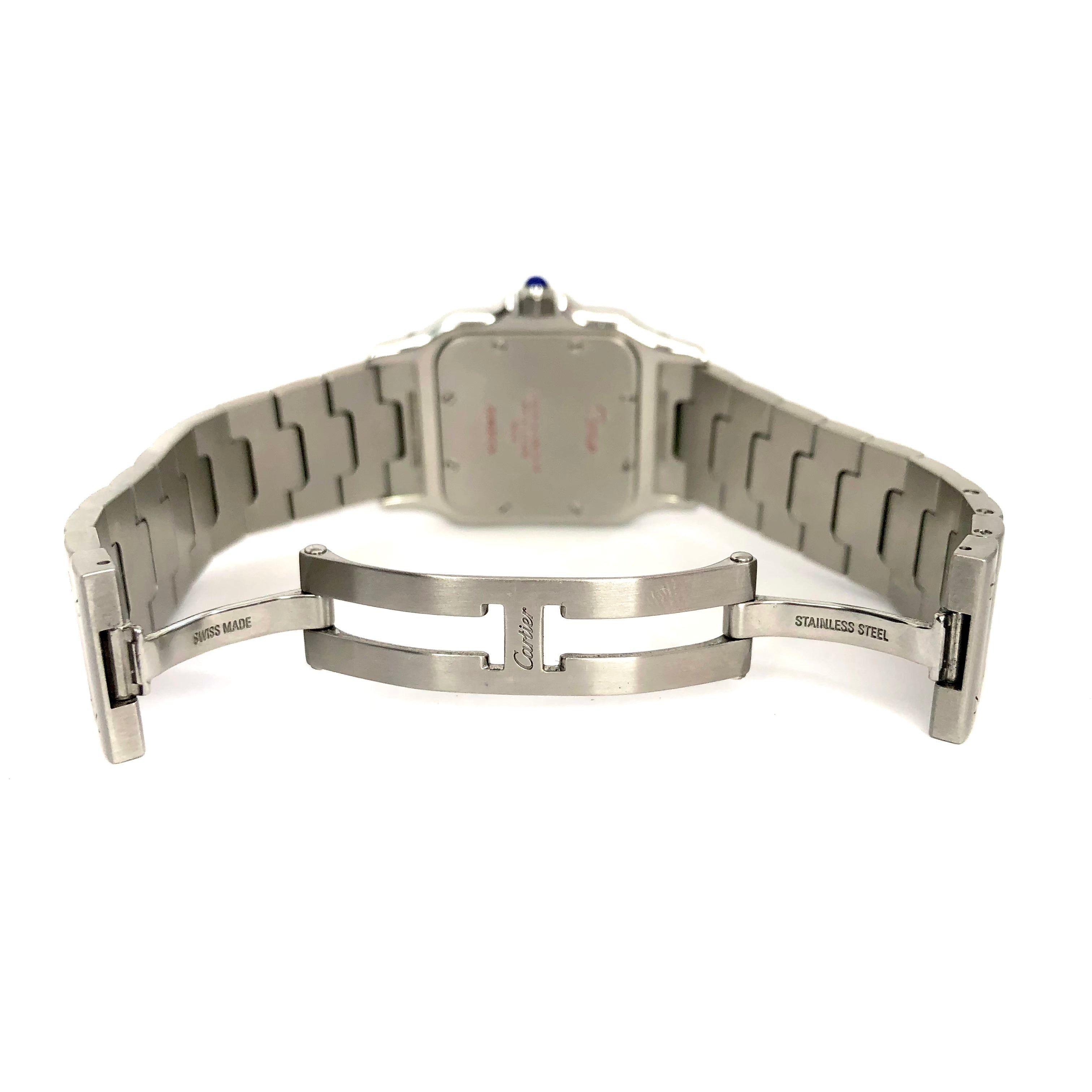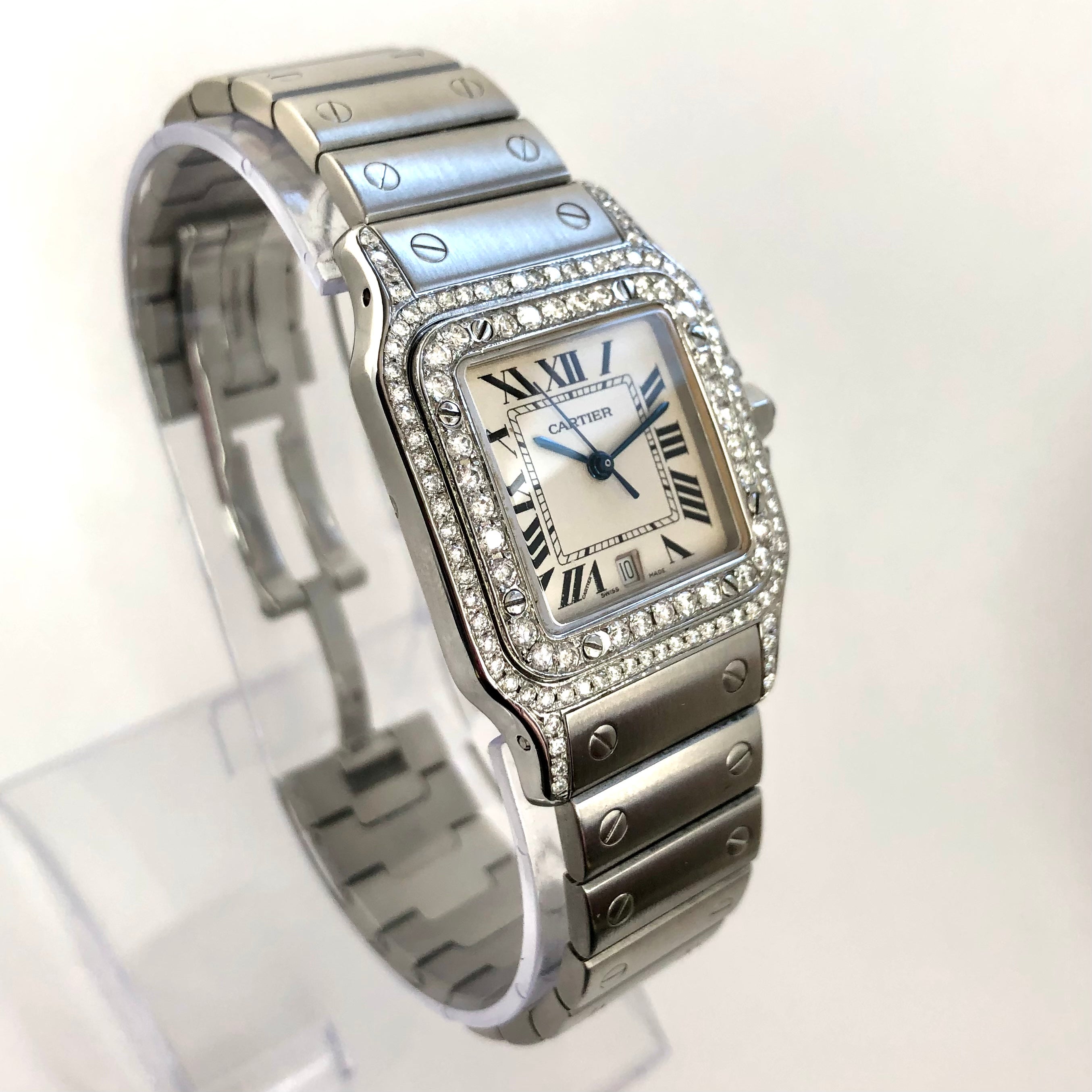 This Women's Cartier Santos de Cartier is a luxurious and stylish watch. The case measures 29 mm. The bracelet is made of Stainless Steel and is set with White. The dial is Cream, enhancing its visual appeal. Powered by a Quartz movement, the watch includes functions such as Date Indicator. Offered in Good condition, and comes with a seller's warranty of 60 months. Also available on custom order with additional options.