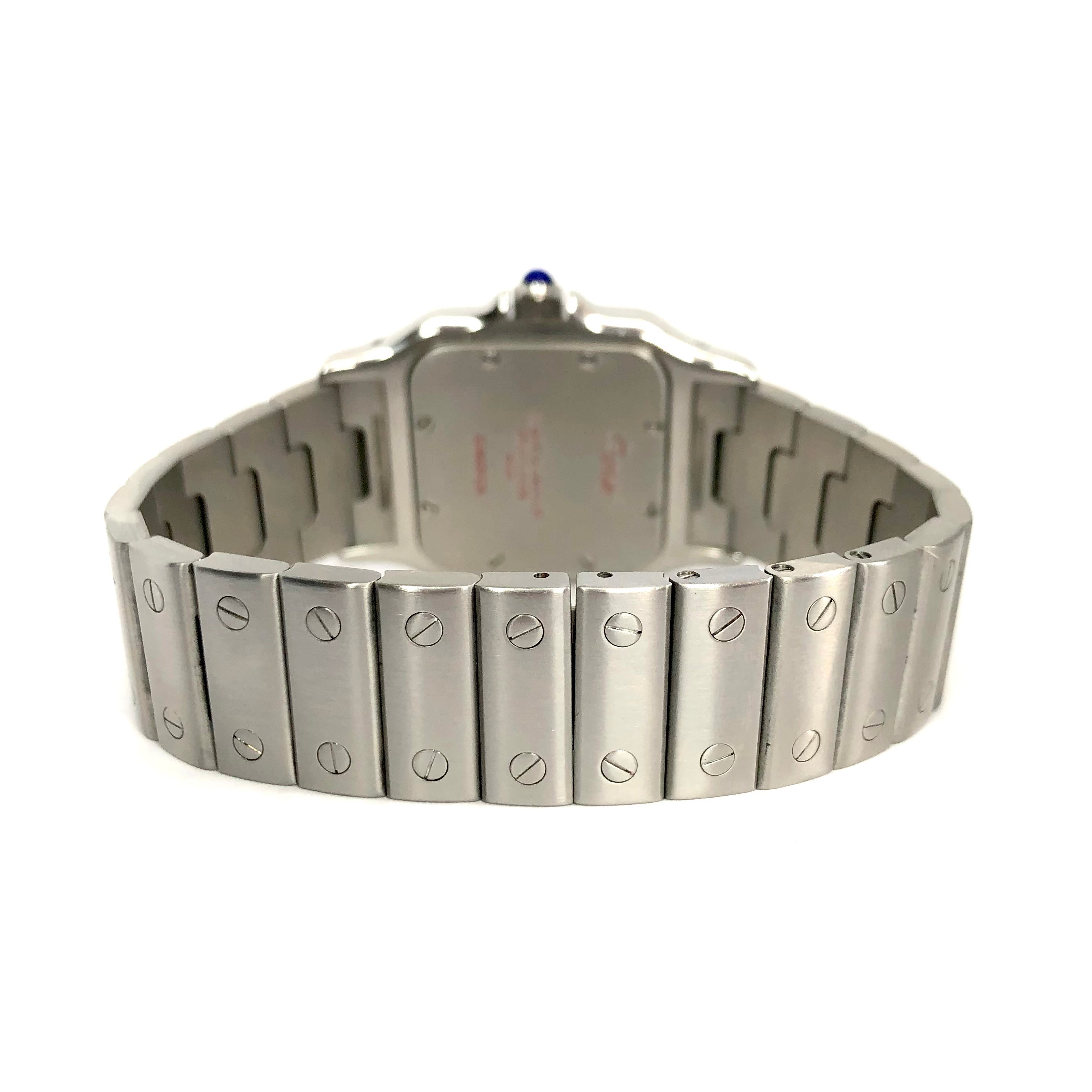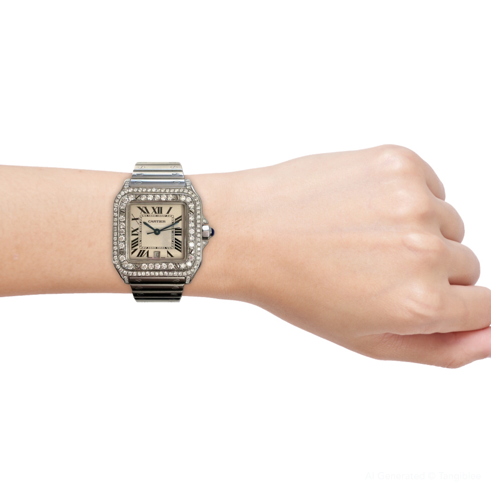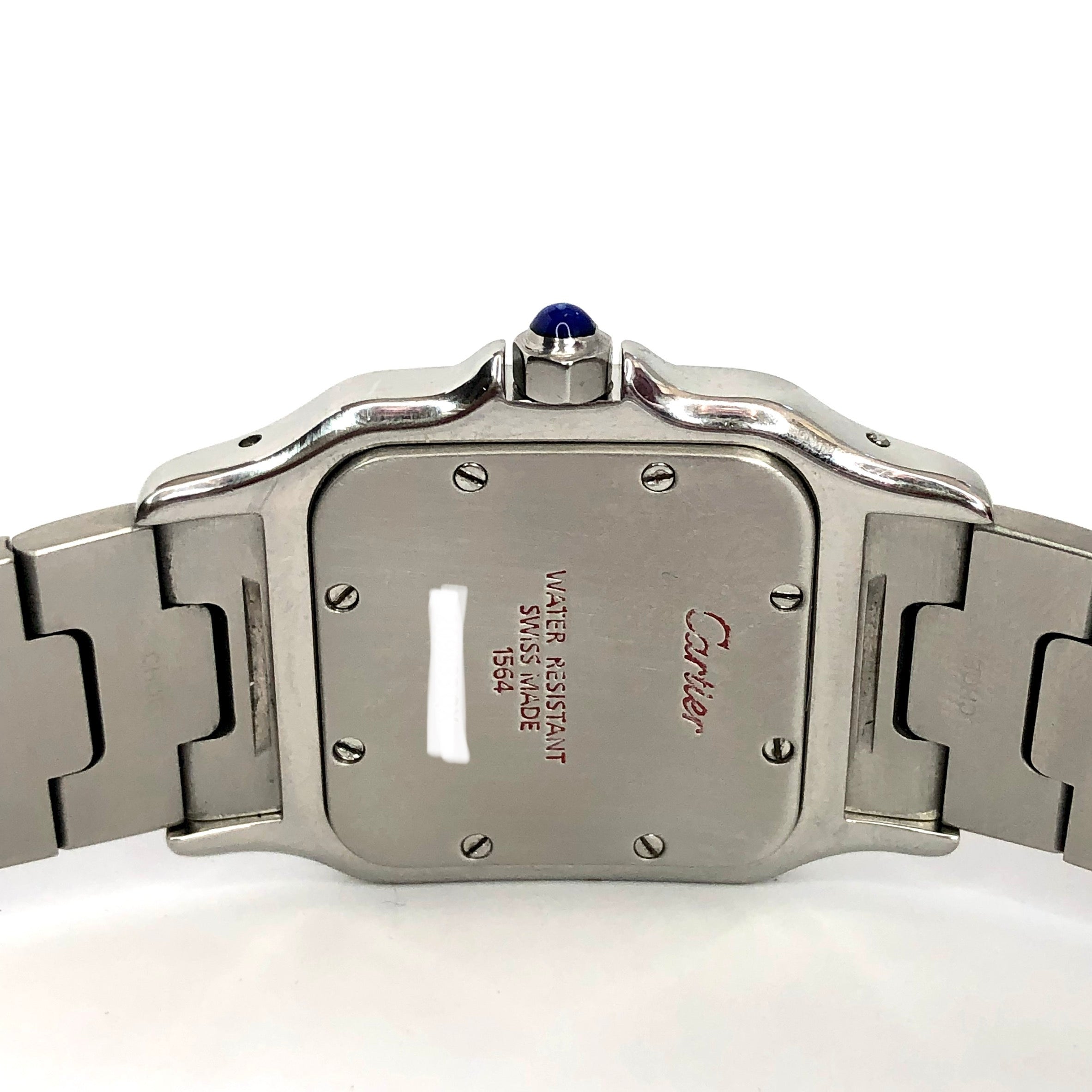 This Women's Cartier Santos de Cartier is a luxurious and stylish watch. The case measures 29 mm. The bracelet is made of Stainless Steel and is set with White. The dial is Cream, enhancing its visual appeal. Powered by a Quartz movement, the watch includes functions such as Date Indicator. Offered in Good condition, and comes with a seller's warranty of 60 months. Also available on custom order with additional options.