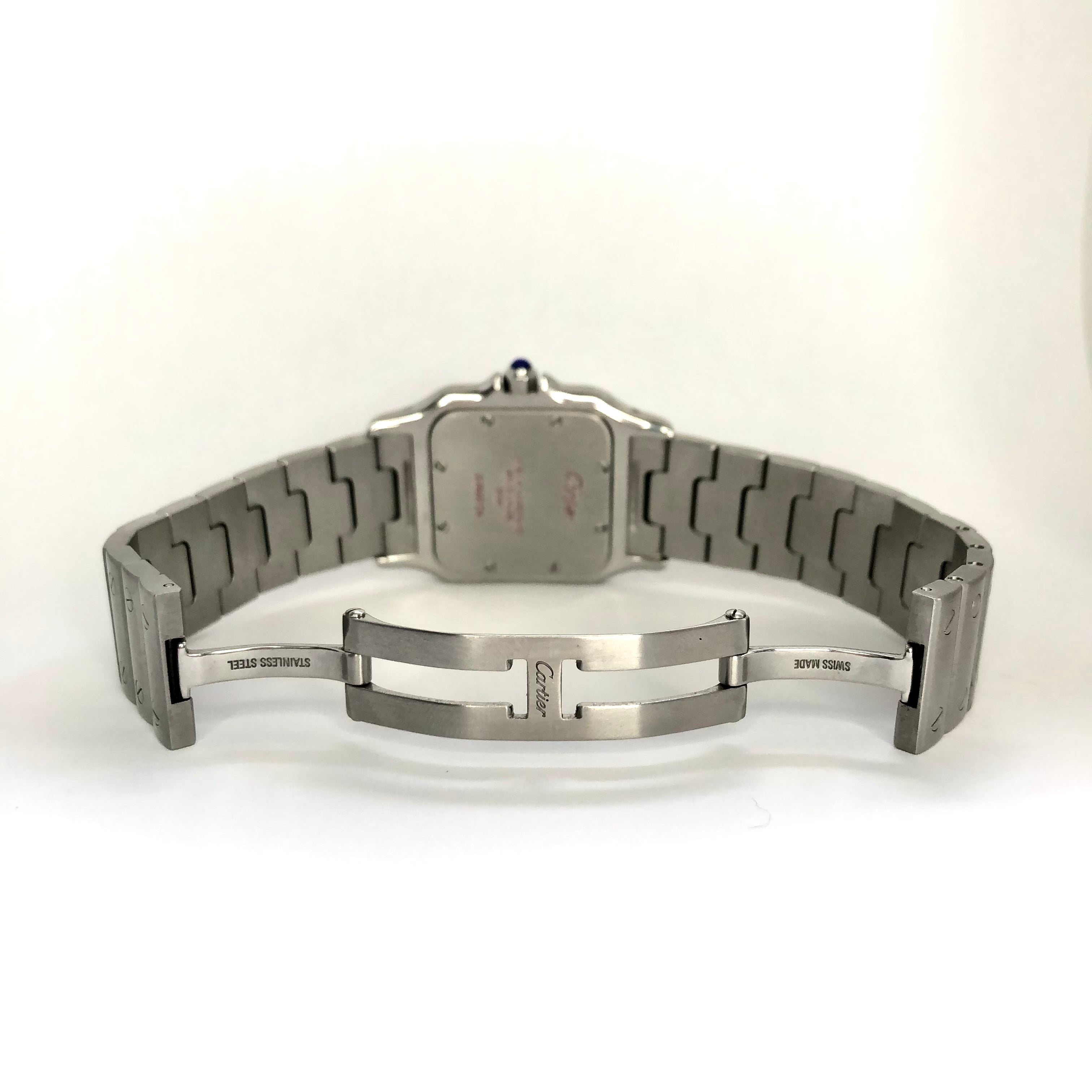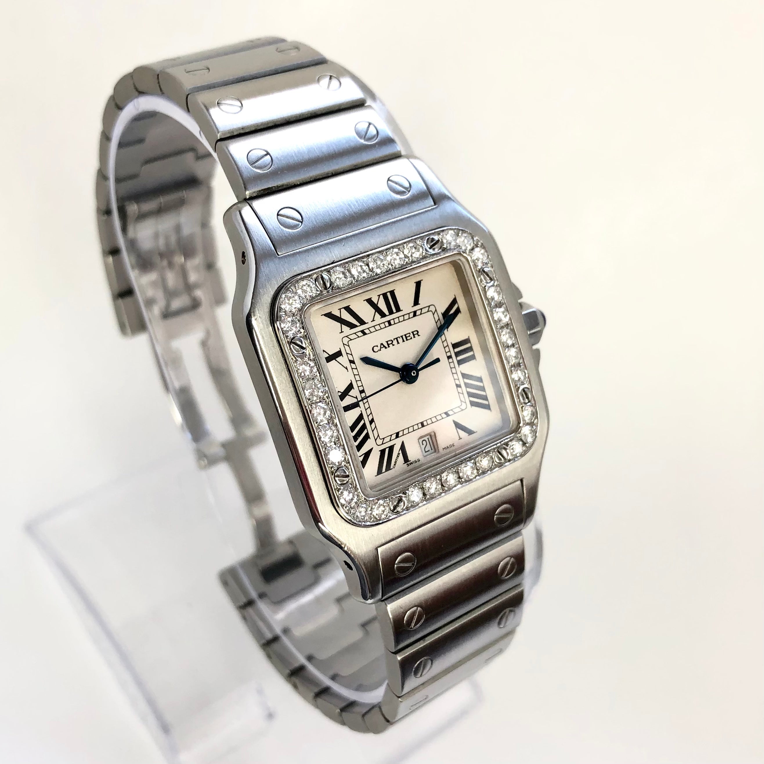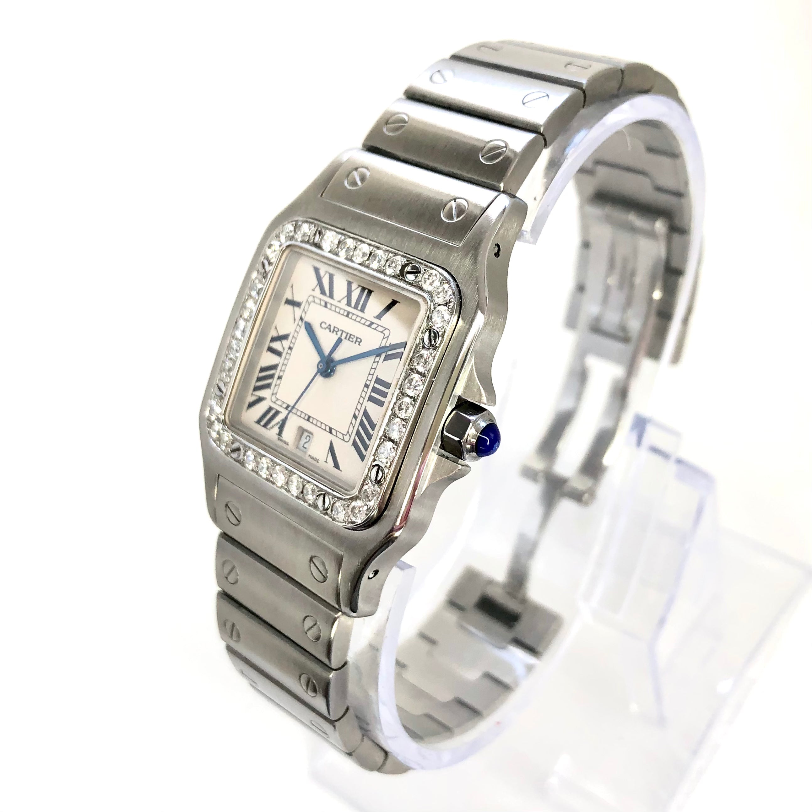 This Women's Cartier Santos de Cartier is a luxurious and stylish watch. The case measures 29 mm. The bracelet is made of Stainless Steel and is set with White. The dial is Cream, enhancing its visual appeal. Powered by a Quartz movement, the watch includes functions such as Date Indicator. Offered in Good condition, and comes with a seller's warranty of 60 months. Also available on custom order with additional options.