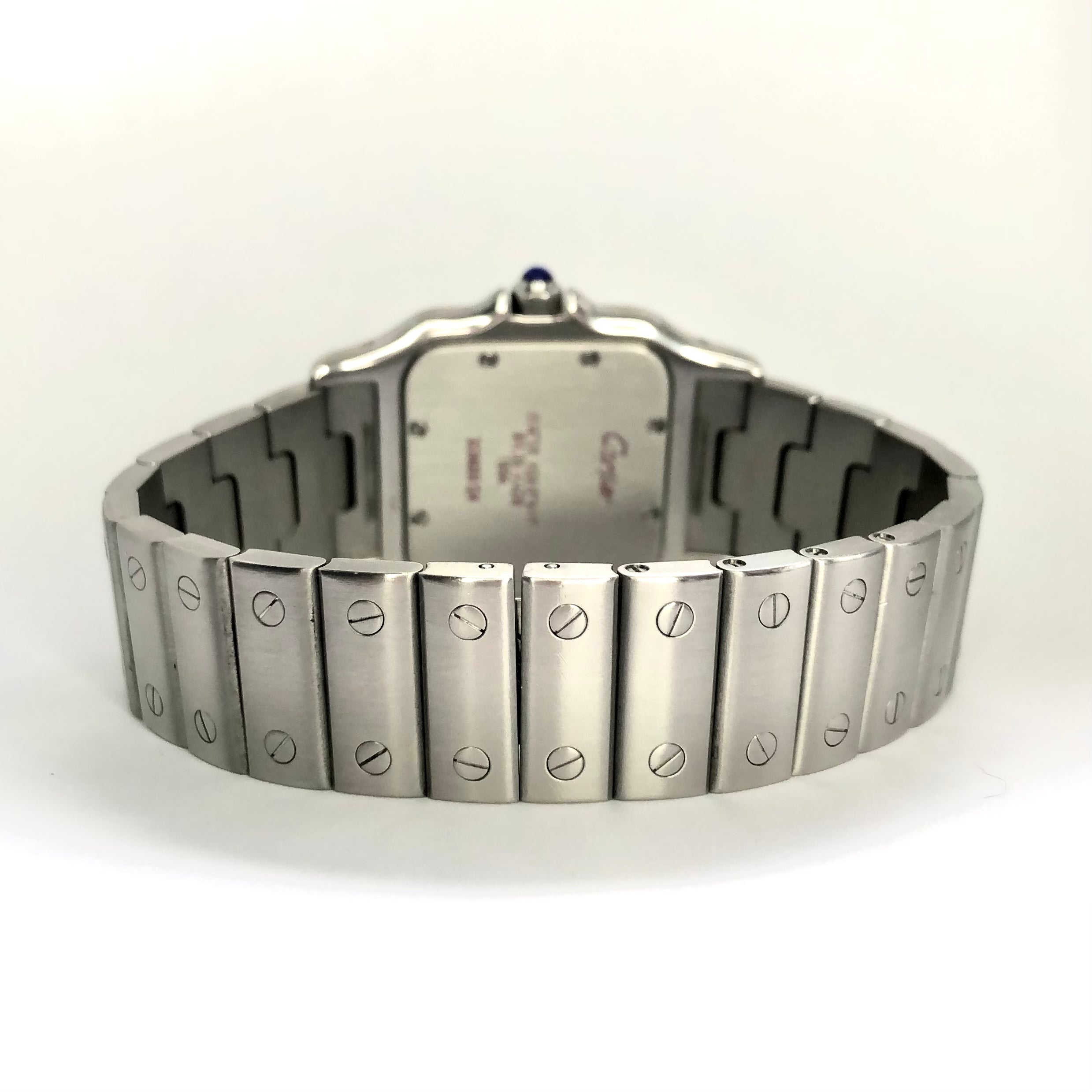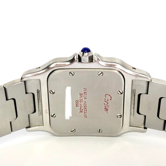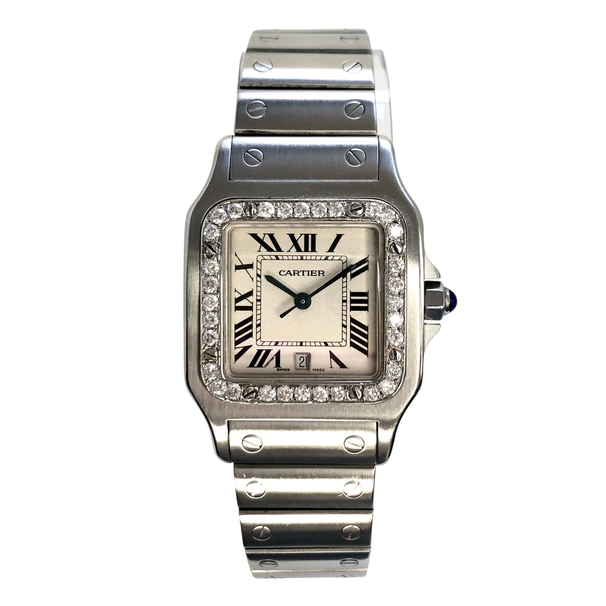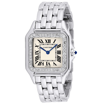 This Women's Cartier Santos de Cartier is a luxurious and stylish watch. The case measures 29 mm. The bracelet is made of Stainless Steel and is set with White. The dial is Cream, enhancing its visual appeal. Powered by a Quartz movement, the watch includes functions such as Date Indicator. Offered in Good condition, and comes with a seller's warranty of 60 months. Also available on custom order with additional options.