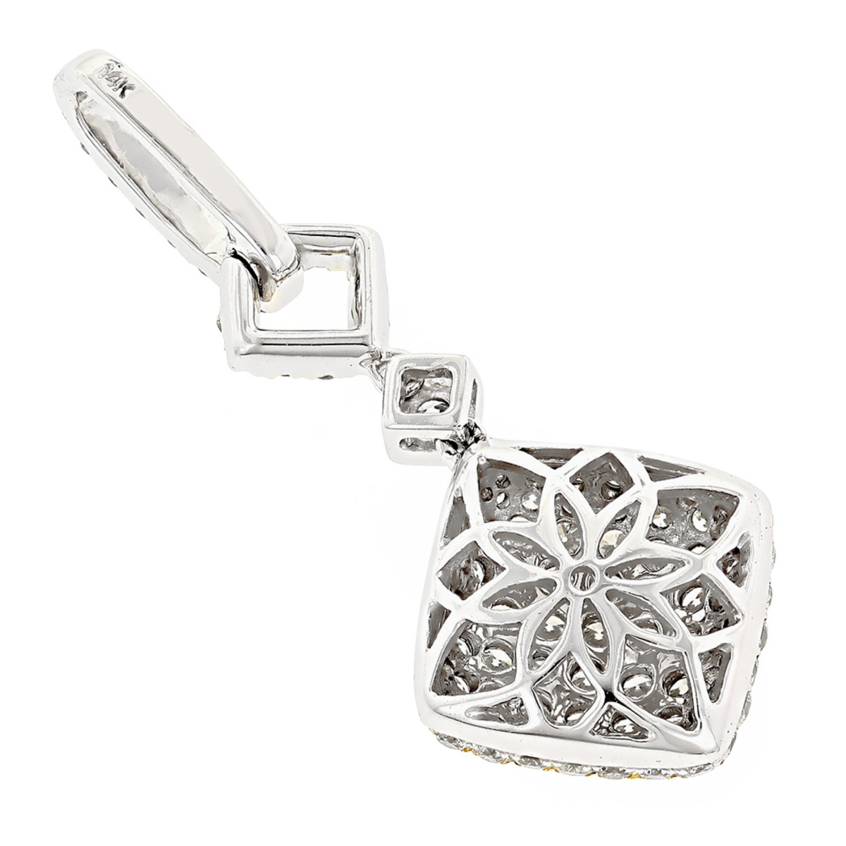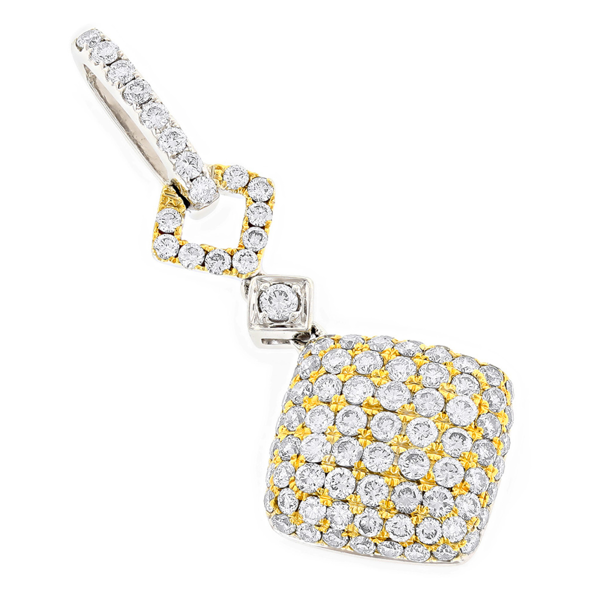 This Women's Diamond pendant is made from 14k Gold, weighing 4 grams and is 16 mm wide. This Women's Diamond pendant is designed in a shape and features 2.08 carats of White Diamonds, and is available in 14k white gold, yellow gold and rose gold as well as 18k gold and platinum as a custom order.