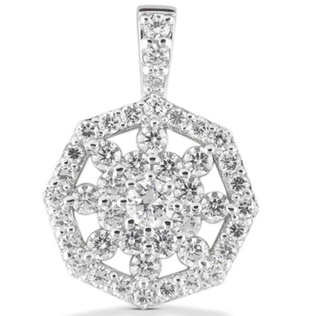 This Women's Diamond pendant is made from 14k Gold, weighing 5 grams and is 16 mm wide. This Women's Diamond pendant is designed in a shape and features 1.64 carats of White Diamonds, and is available in 14k white gold, yellow gold and rose gold as well as 18k gold and platinum as a custom order.