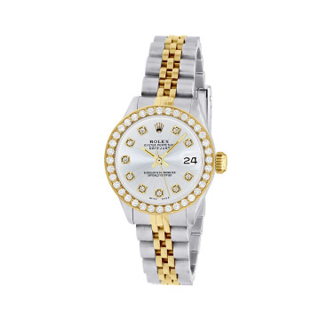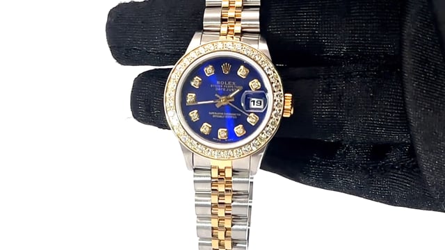 This Women's Two-Tone Rolex Datejust is a luxurious and stylish watch. The watch is made of Gold/Stainless Steel, offering a premium feel. The case measures 26 mm. The bracelet is made of Stainless Steel It features a Jubilee style bracelet for a comfortable fit. And is set with Diamonds. The dial is Blue, enhancing its visual appeal. Powered by an Automatic movement. Offered in Good condition, and comes with a seller's warranty of 60 months. Also available on custom order with additional options. These pre-owned Rolex watches are authentic Rolex watches with genuine diamonds, in excellent condition, they are checked for authenticity and basic water resistance. Watches will withstand an occasional rain just fine, but they are not diver's watches and should not be worn in shower or while swimming.