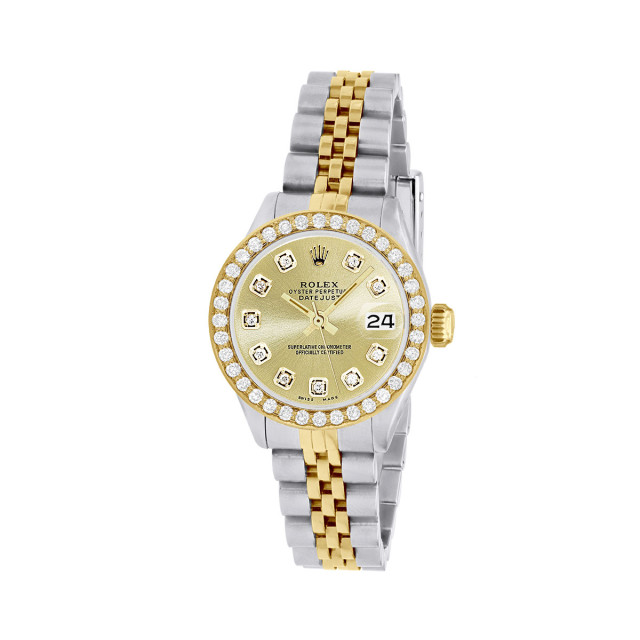 This Women's Two-Tone Rolex Oyster Perpetual Datejust is a luxurious and stylish watch. The watch is made of Gold/Stainless Steel, offering a premium feel. The case measures 26 mm. The bracelet is made of Stainless Steel It features a Jubilee style bracelet for a comfortable fit. The bezel is made of Yellow Gold and is set with White Diamonds. The dial is Champagne, enhancing its visual appeal. Powered by an Automatic movement. Offered in Good condition, and comes with a seller's warranty of 60 months. Also available on custom order with additional options. These pre-owned Rolex watches are authentic Rolex watches with genuine diamonds, in excellent condition, they are checked for authenticity and basic water resistance. Watches will withstand an occasional rain just fine, but they are not diver's watches and should not be worn in shower or while swimming.