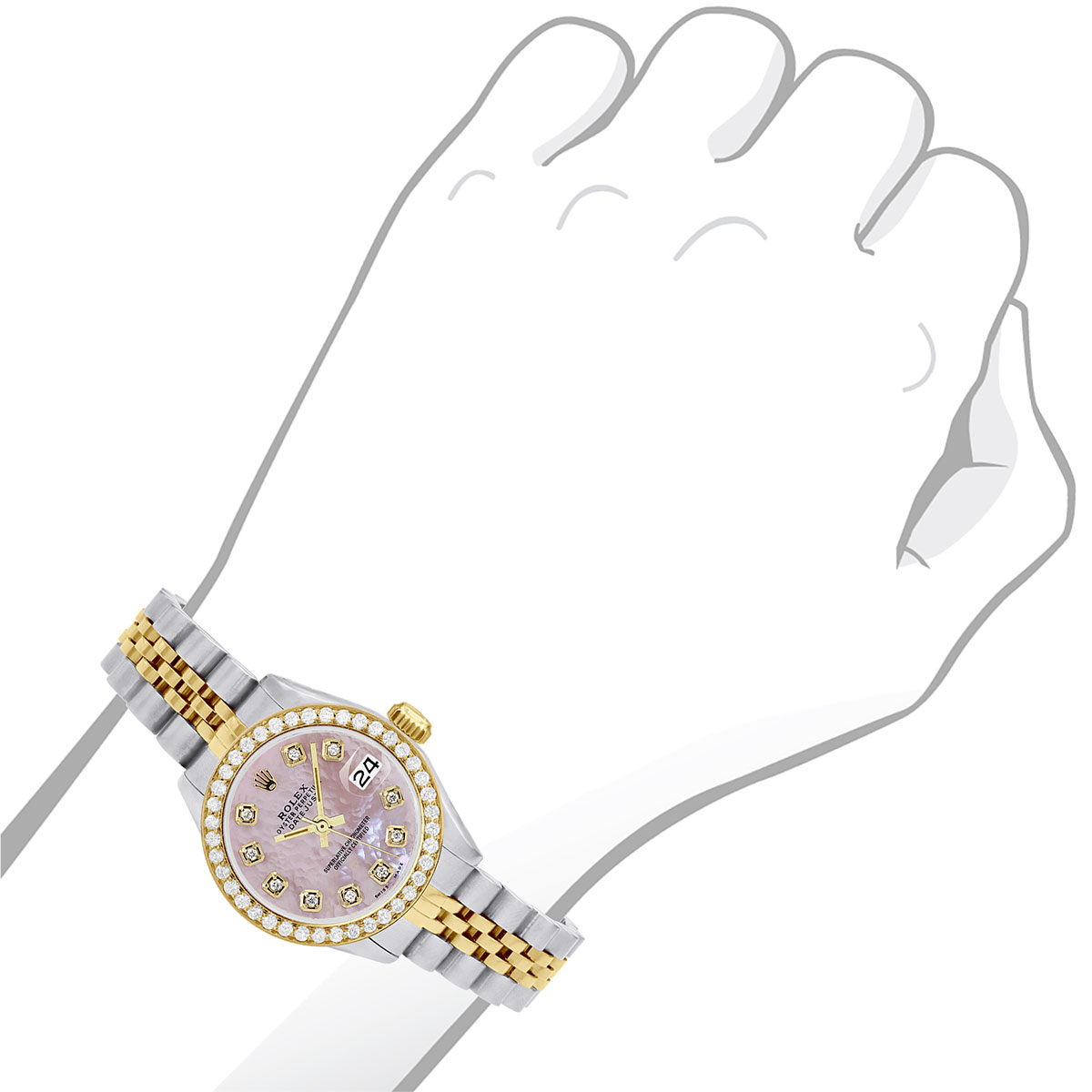 This Women's Two-Tone Rolex Oyster Perpetual Datejust is a luxurious and stylish watch. The watch is made of Gold/Stainless Steel, offering a premium feel. The case measures 26 mm. The bracelet is made of Stainless Steel It features a Jubilee style bracelet for a comfortable fit. The bezel is made of Yellow Gold and is set with White Diamonds. The dial is Pink, enhancing its visual appeal. Powered by an Automatic movement, the watch includes functions such as Date Indicator. Offered in New condition, and comes with a seller's warranty of 60 months. Also available on custom order with additional options. These pre-owned Rolex watches are authentic Rolex watches with genuine diamonds, in excellent condition, they are checked for authenticity and basic water resistance. Watches will withstand an occasional rain just fine, but they are not diver's watches and should not be worn in shower or while swimming.