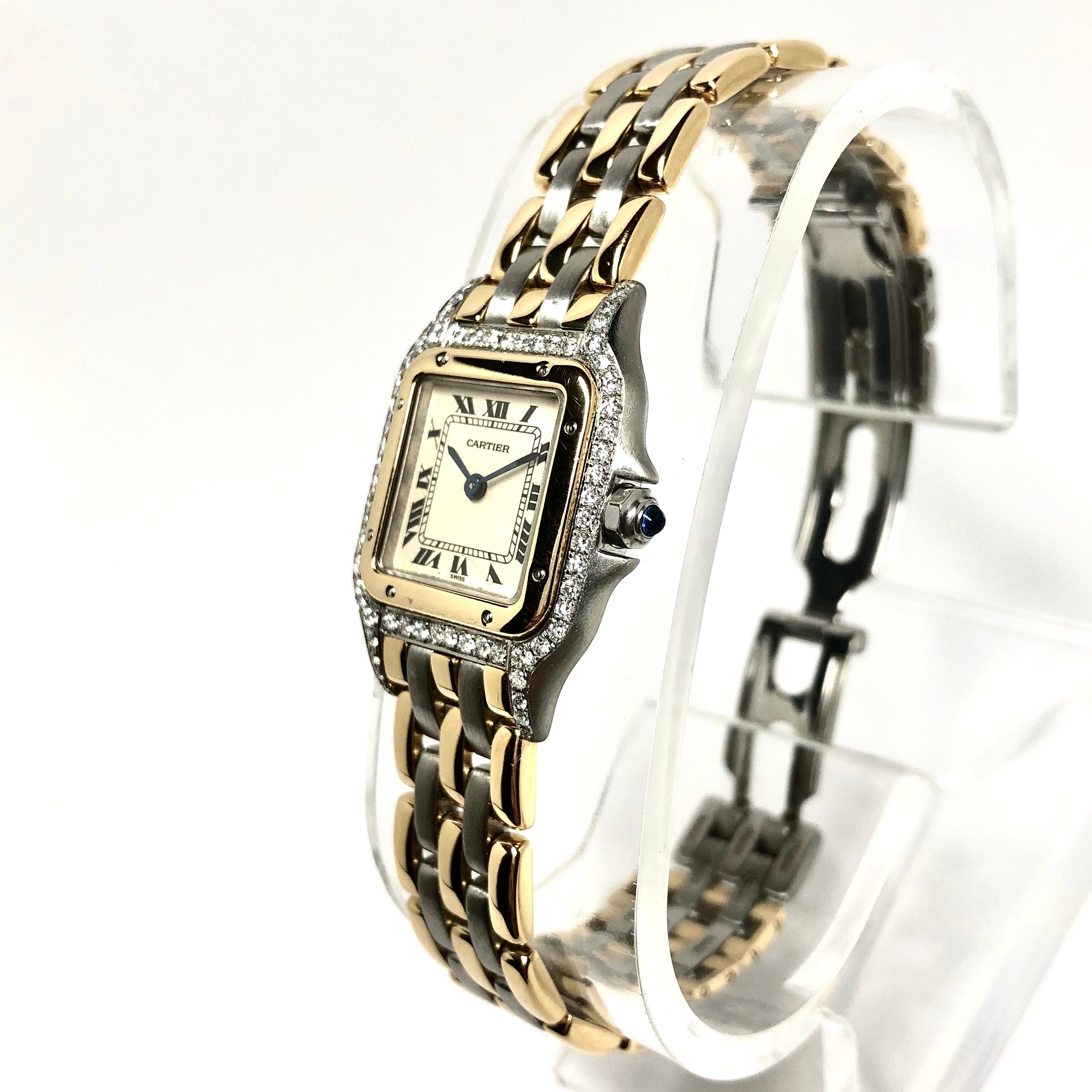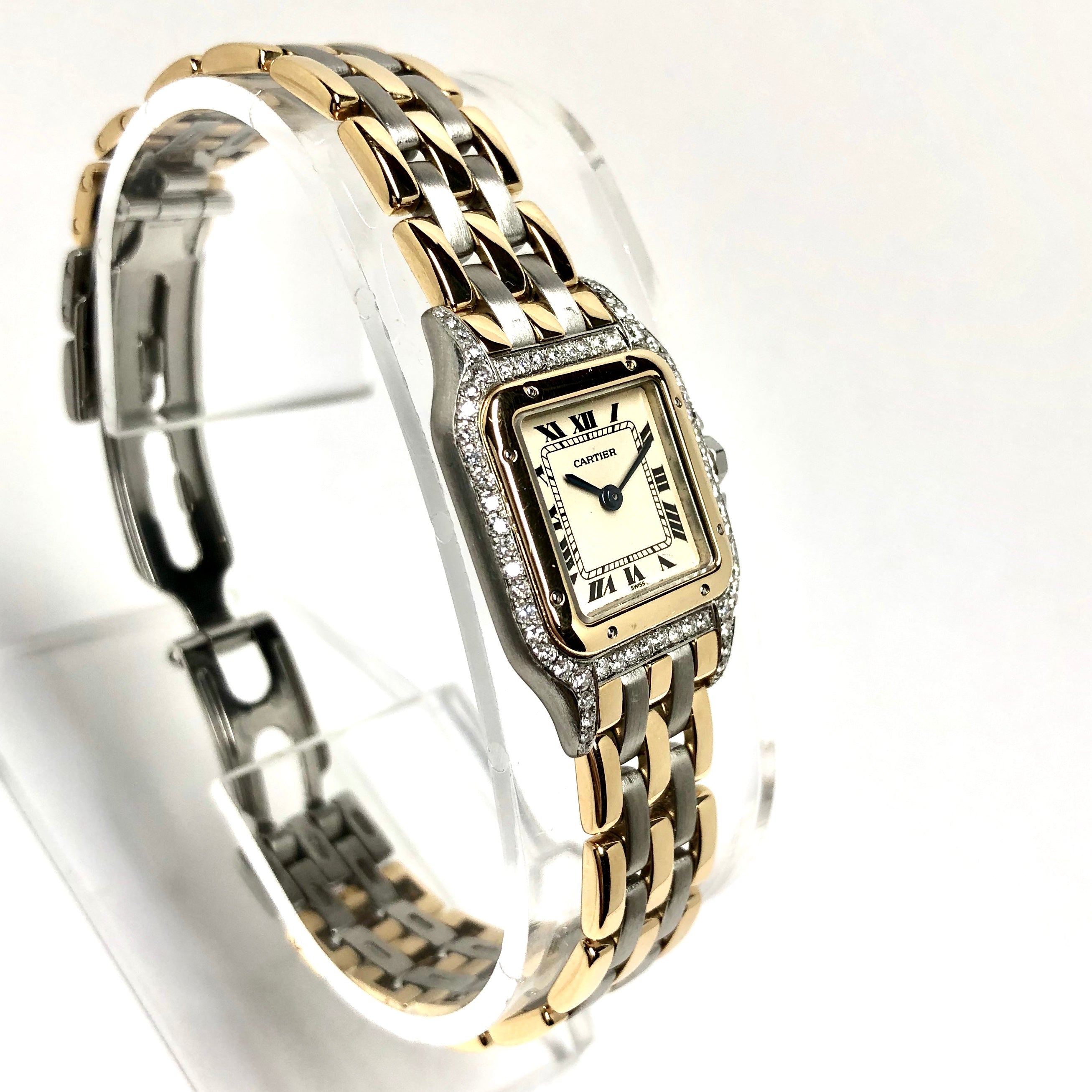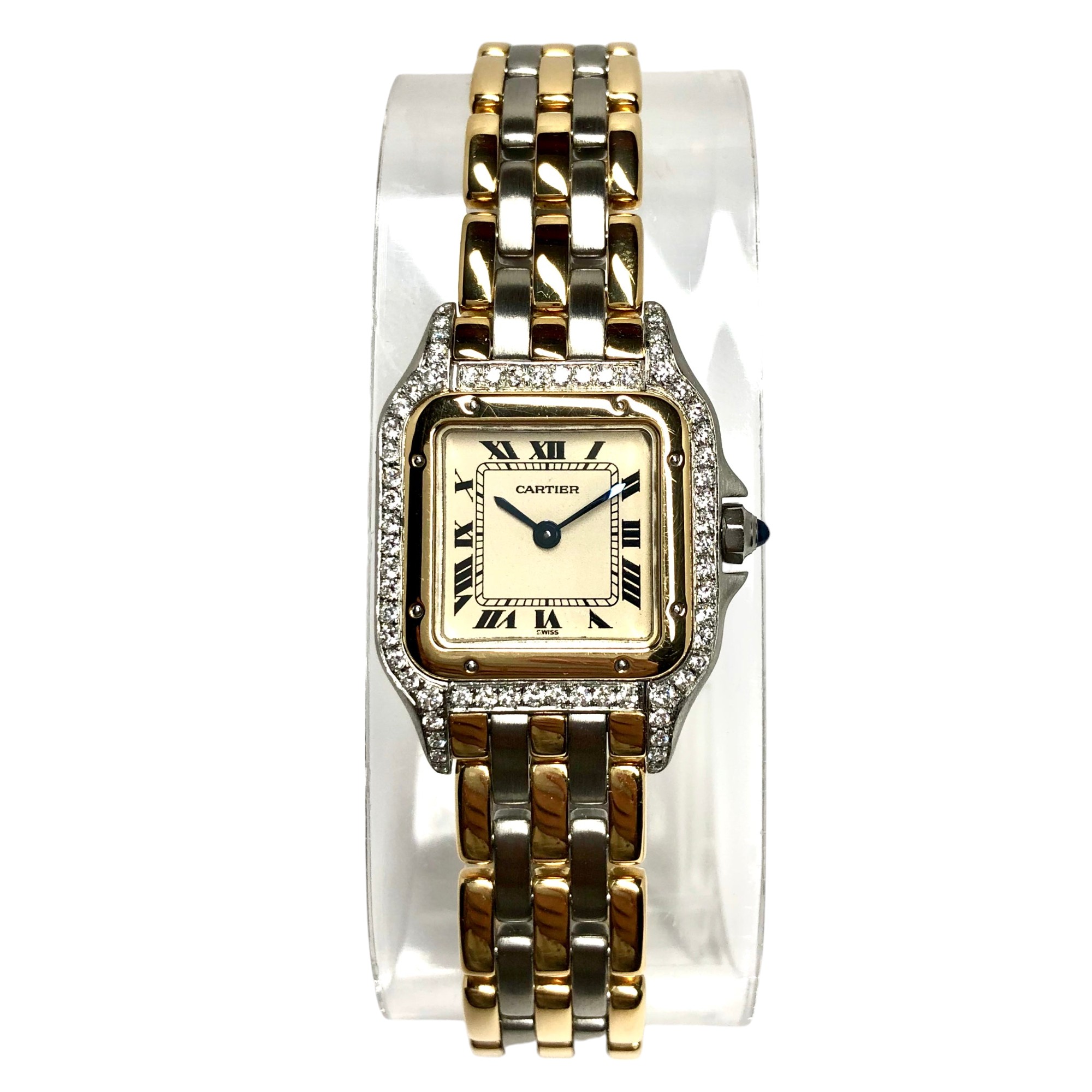 This Women's Two-Tone Cartier La Panthere is a luxurious and stylish watch. The watch is made of Gold/Stainless Steel, offering a premium feel. The case measures 22 mm. The bracelet is made of Yellow Gold. The bezel is made of Gold. The dial is Cream, enhancing its visual appeal. Powered by a Swiss-Quartz movement. Offered in Good condition, and comes with a seller's warranty of 60 months. Also available on custom order with additional options.
