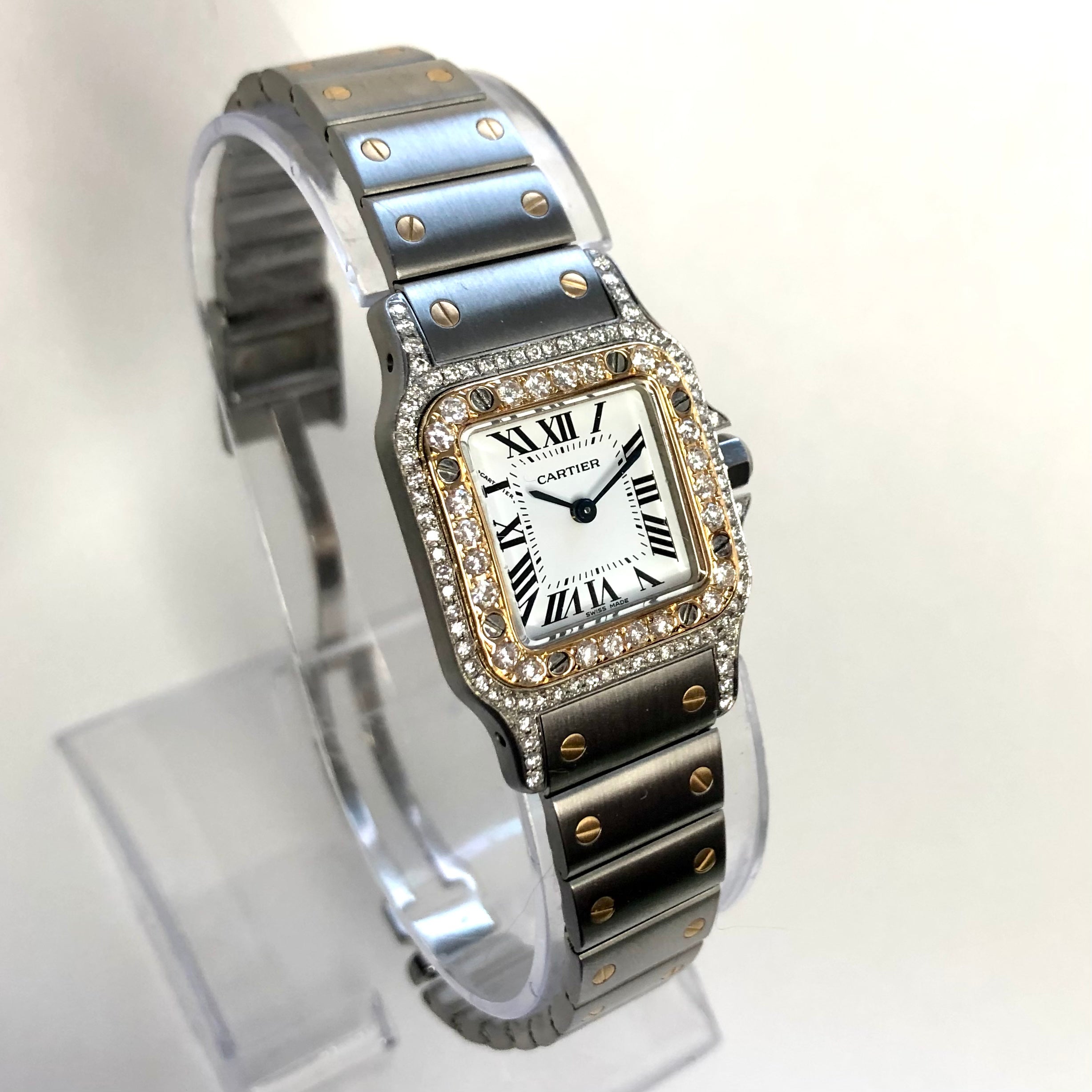 This Women's Two-Tone Cartier Santos de Cartier Galbee is a luxurious and stylish watch. The watch is made of Gold/Stainless Steel, offering a premium feel. The case measures 24 mm. The bracelet is made of Yellow Gold. The bezel is made of Gold and is set with White. The dial is White, enhancing its visual appeal. Powered by a Quartz movement. Offered in Good condition, and comes with a seller's warranty of 60 months. Also available on custom order with additional options.