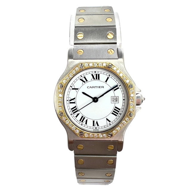 This Women's Two-Tone Cartier SANTOS OCTAGON is a luxurious and stylish watch. The watch is made of Gold/Stainless Steel, offering a premium feel. The case measures 31 mm. The bracelet is made of Yellow Gold. The bezel is made of Gold and is set with White. The dial is White, enhancing its visual appeal. Powered by an Automatic movement. Offered in Good condition, and comes with a seller's warranty of 60 months. Also available on custom order with additional options.