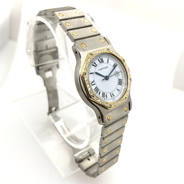 This Women's Two-Tone Cartier SANTOS OCTAGON is a luxurious and stylish watch. The watch is made of Gold/Stainless Steel, offering a premium feel. The case measures 31 mm. The bracelet is made of Yellow Gold. The bezel is made of Gold and is set with White. The dial is White, enhancing its visual appeal. Powered by an Automatic movement, the watch includes functions such as Date Indicator. Offered in Good condition, and comes with a seller's warranty of 60 months. Also available on custom order with additional options.