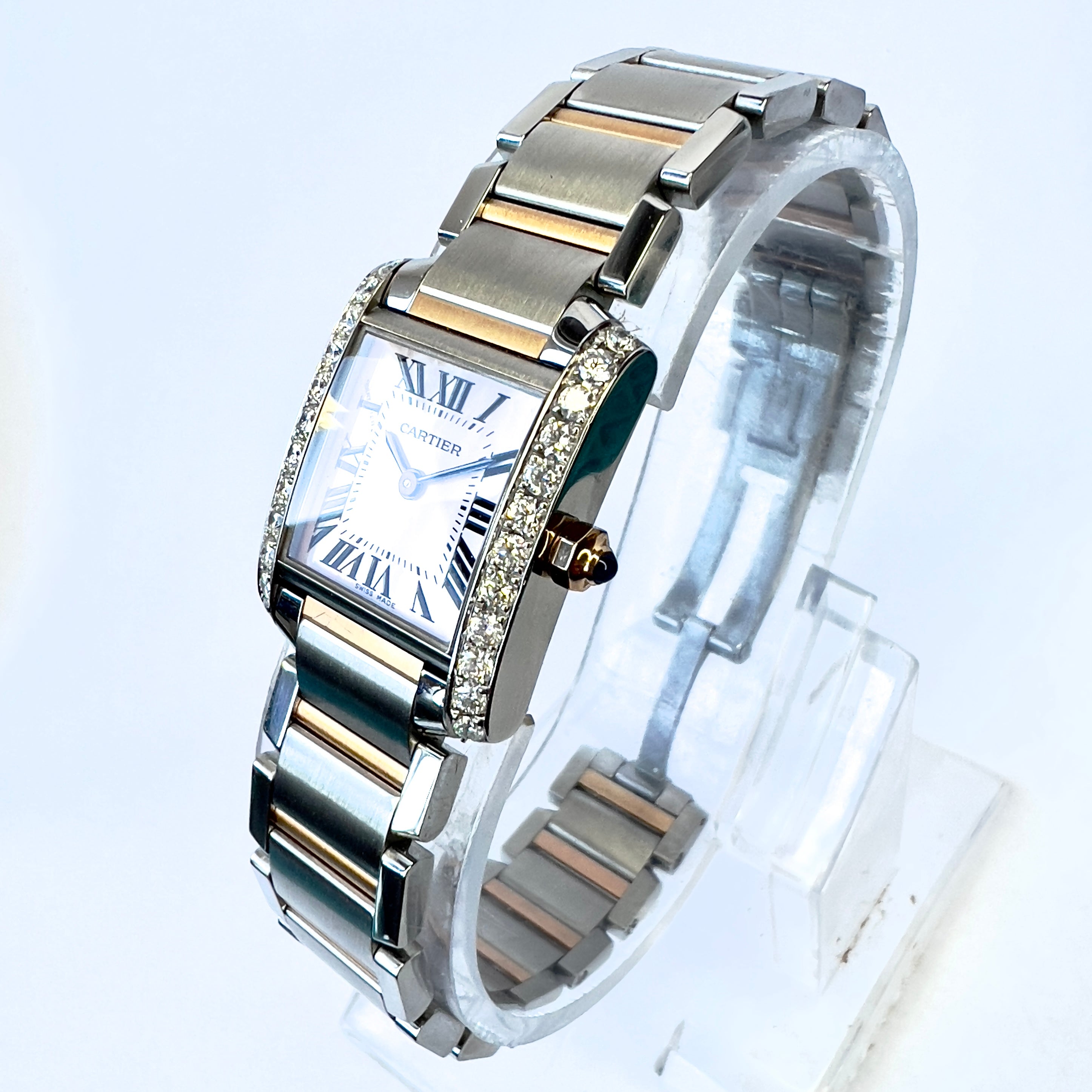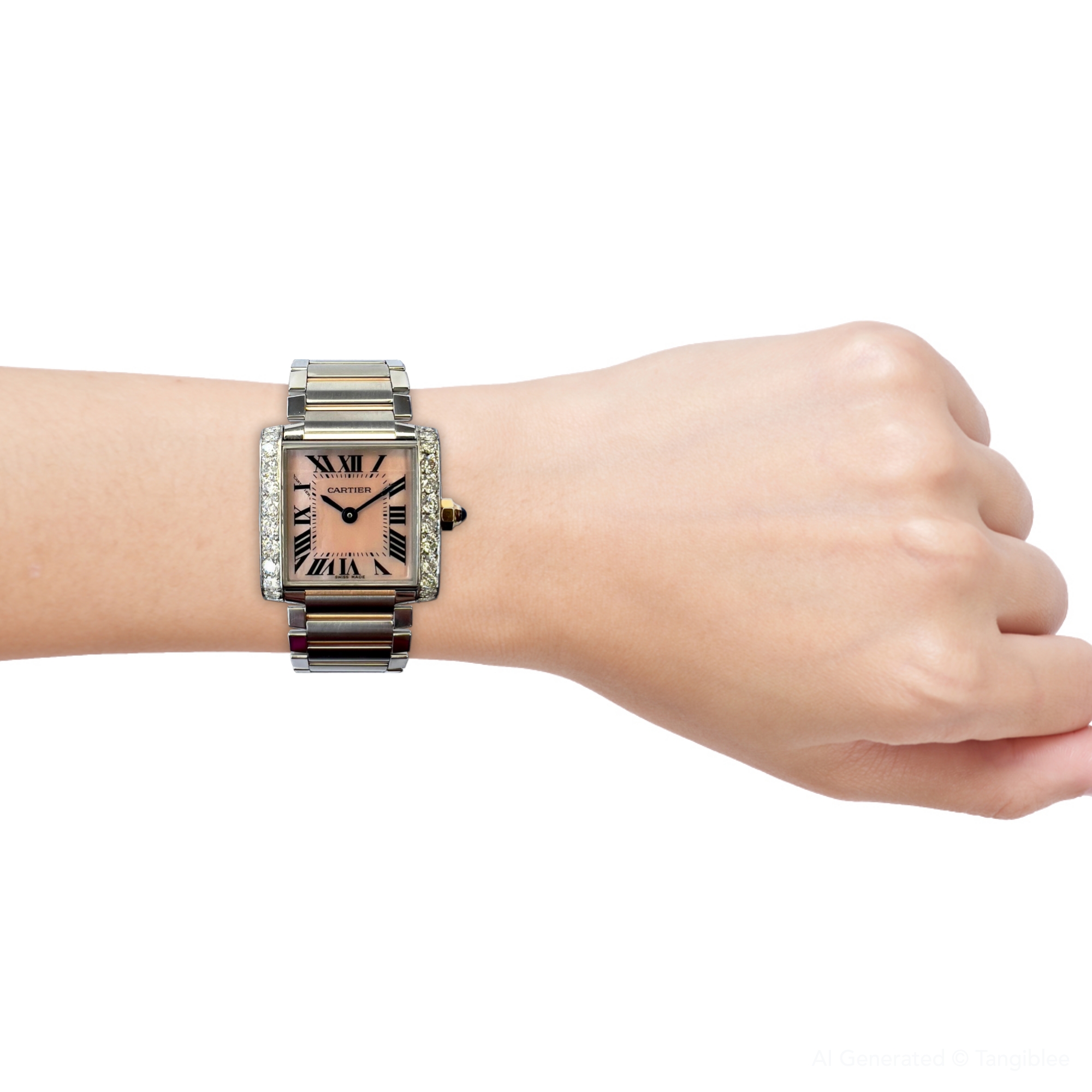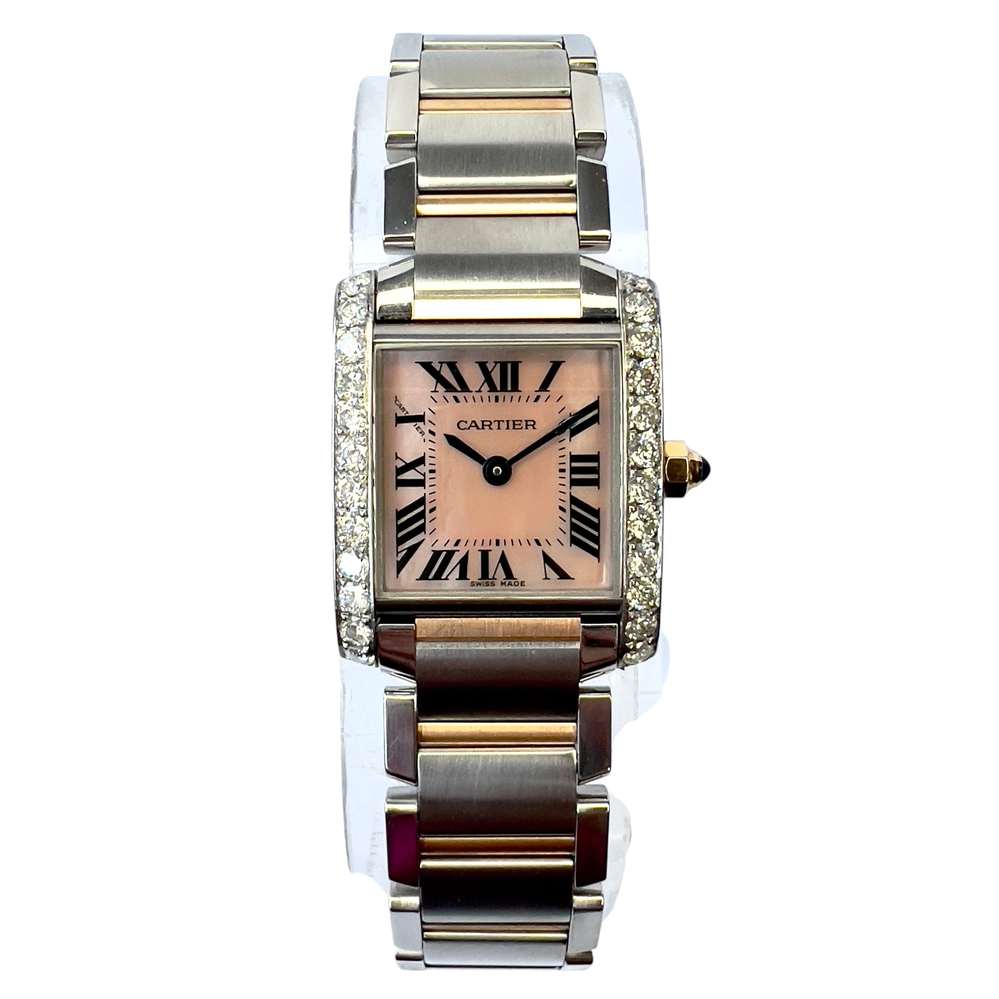 This Women's Two-Tone Cartier Tank Francaise is a luxurious and stylish watch. The watch is made of Gold/Stainless Steel, offering a premium feel. The case measures 20 mm. The bracelet is made of Yellow Gold and is set with White. The dial is Pink, enhancing its visual appeal. Powered by a Quartz movement. Offered in Good condition, and comes with a seller's warranty of 60 months. Also available on custom order with additional options.