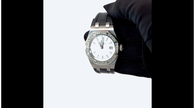 This Women's Audemars Piguet Royal Oak is a luxurious and stylish watch. It features a Silver color scheme, adding sophistication to its design. The watch is made of Stainless Steel, offering a premium feel. The case measures 33 mm. The bracelet is made of Black Rubber. The bezel is made of White Stainless Steel and is set with White Diamonds. The dial is Silver Tone, enhancing its visual appeal the watch includes functions such as Date Indicator. Offered in Good condition, and comes with a seller's warranty of 60 months. Also available on custom order with additional options.