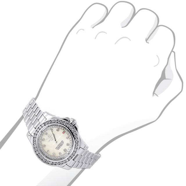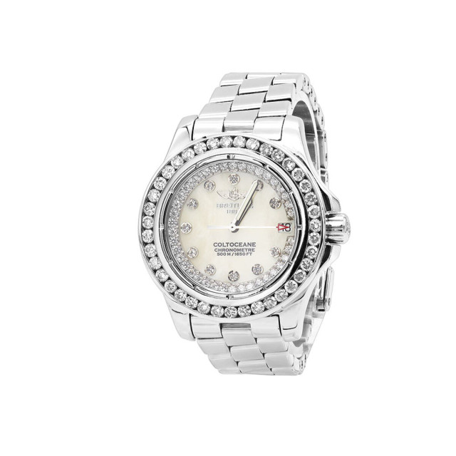This Women's Unique Breitling Colt Oceane is a luxurious and stylish watch. It features a Silver color scheme, adding sophistication to its design. The watch is made of Stainless Steel, offering a premium feel. The case measures 34 mm. The bracelet is made of White Stainless Steel. The bezel is made of White Stainless Steel and is set with White Diamonds. The dial is White, enhancing its visual appeal. Powered by a Quartz movement, the watch includes functions such as Date Indicator. Offered in Very Good condition, and comes with a seller's warranty of 24 months. Also available on custom order with additional options.