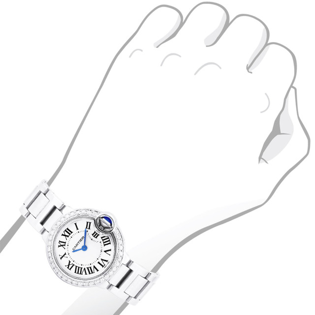 This Women's Cartier Ballon Bleu is a luxurious and stylish watch. The watch is made of Stainless Steel, offering a premium feel. The case measures 28 mm. The bracelet is made of Stainless Steel. The bezel is made of Stainless Steel and is set with White. The dial is Silver, enhancing its visual appeal. Powered by a Quartz movement. Offered in Good condition, and comes with a seller's warranty of 60 months. Also available on custom order with additional options. Please note this Cartier watch is pre-owned, in excellent condition, the diamonds are high quality, natural diamonds, set by our master craftsmen, watch box might show signs of wear (watch itself will be in perfect condition), comes with a 5 year warranty from ItsHot.