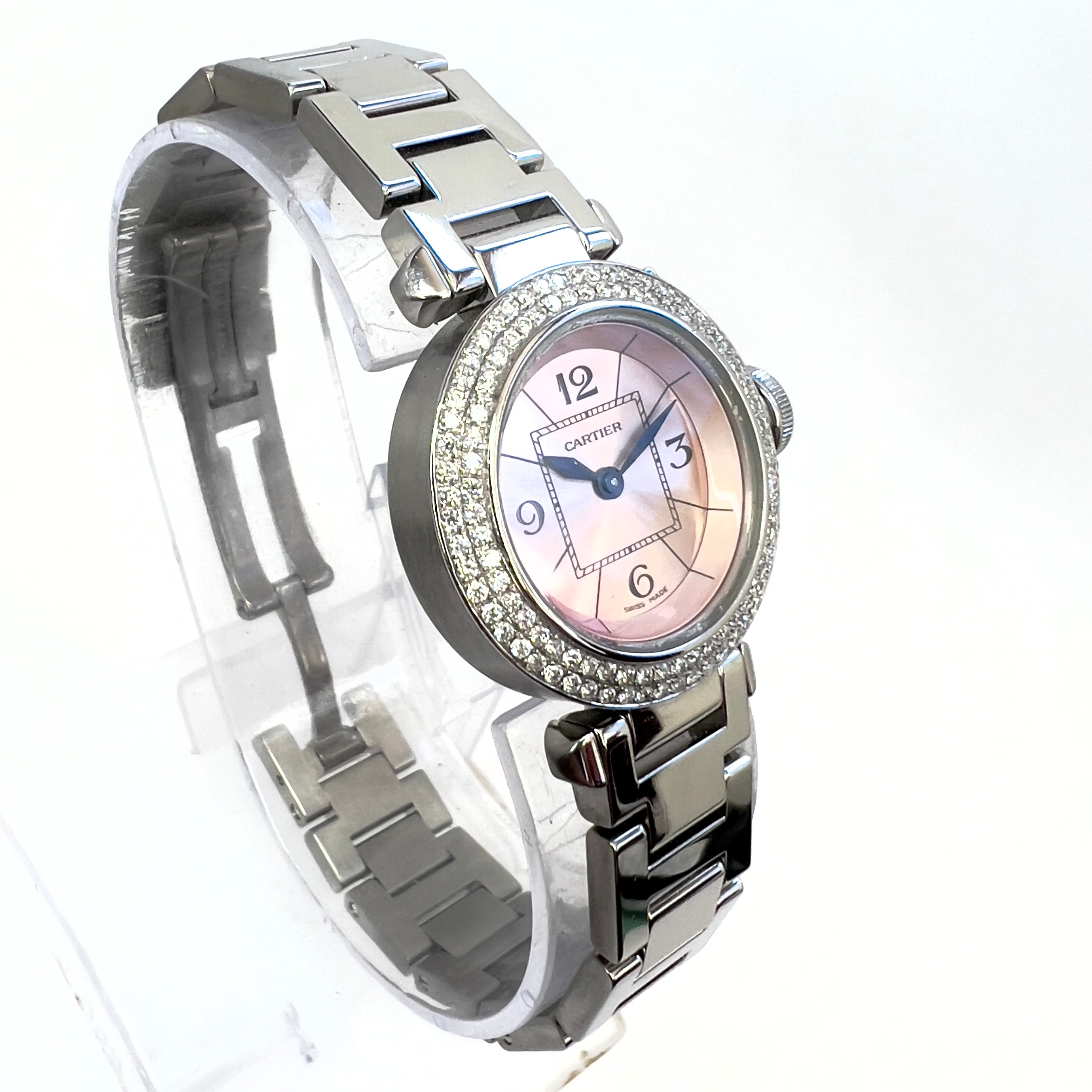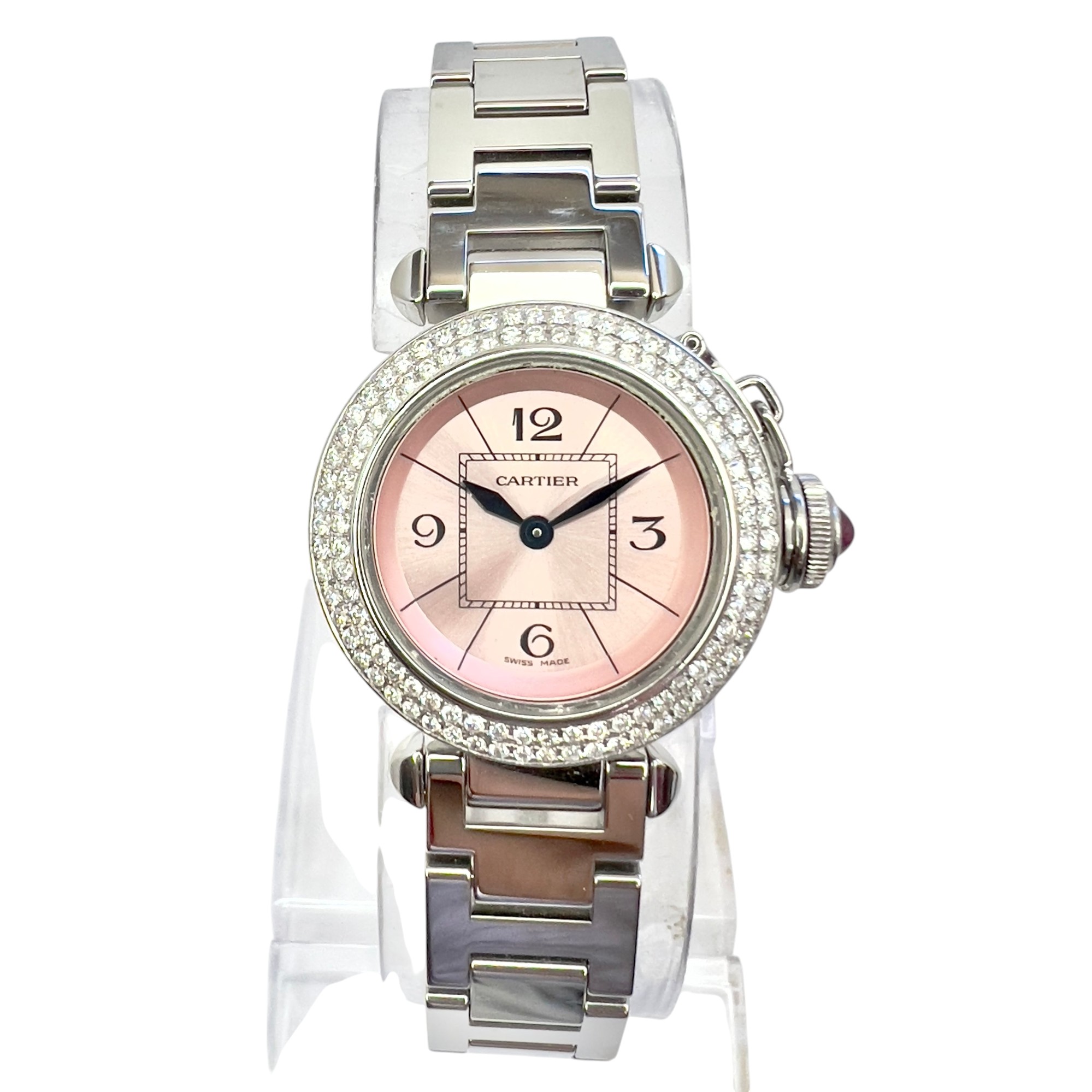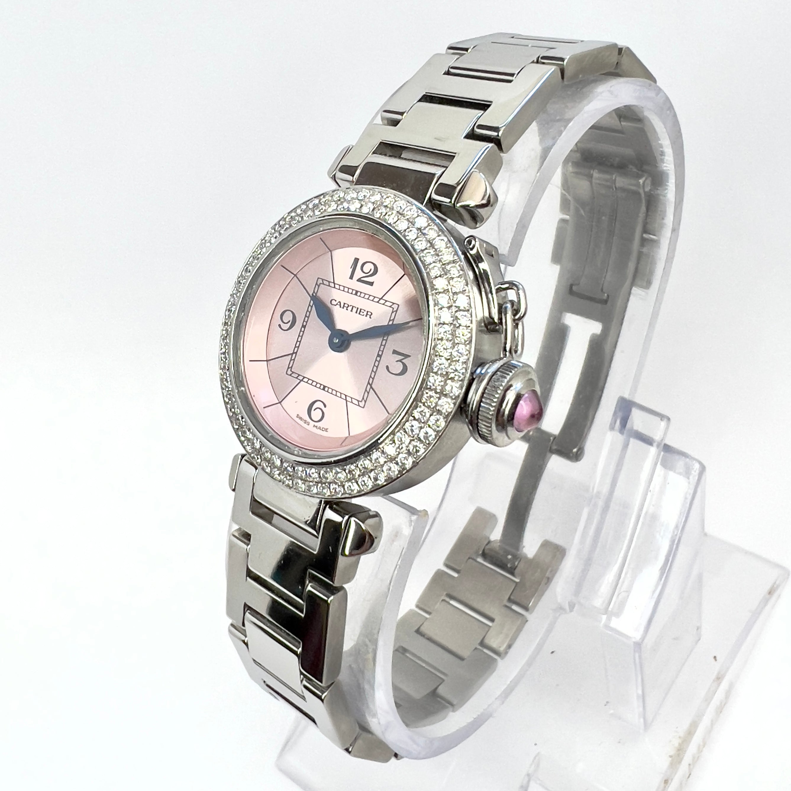 This Women's Cartier Pasha is a luxurious and stylish watch. The watch is made of Stainless Steel, offering a premium feel. The case measures 27 mm. The bracelet is made of Stainless Steel and is set with White. The dial is Pink, enhancing its visual appeal. Powered by a Quartz movement. Offered in Good condition, and comes with a seller's warranty of 60 months. Also available on custom order with additional options.