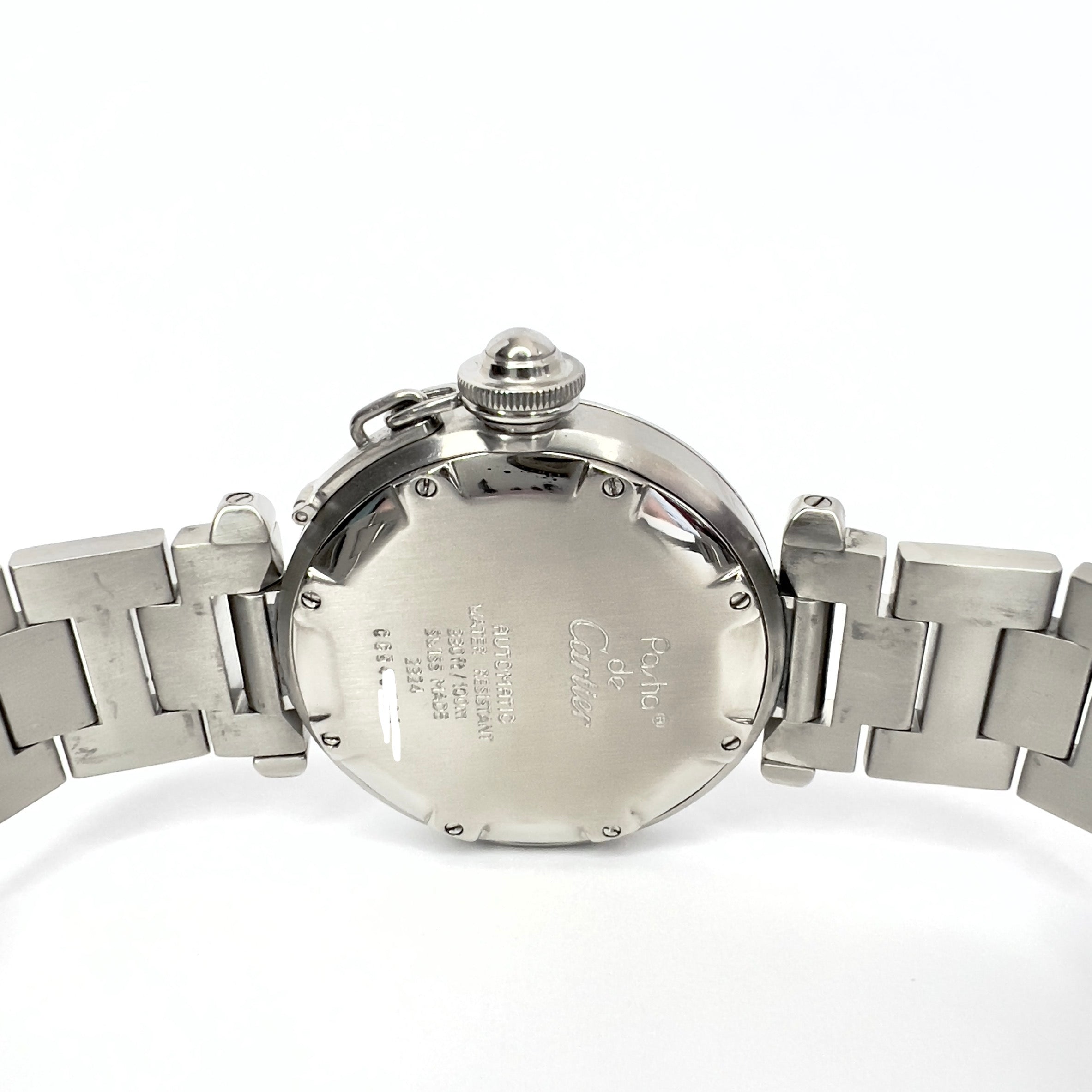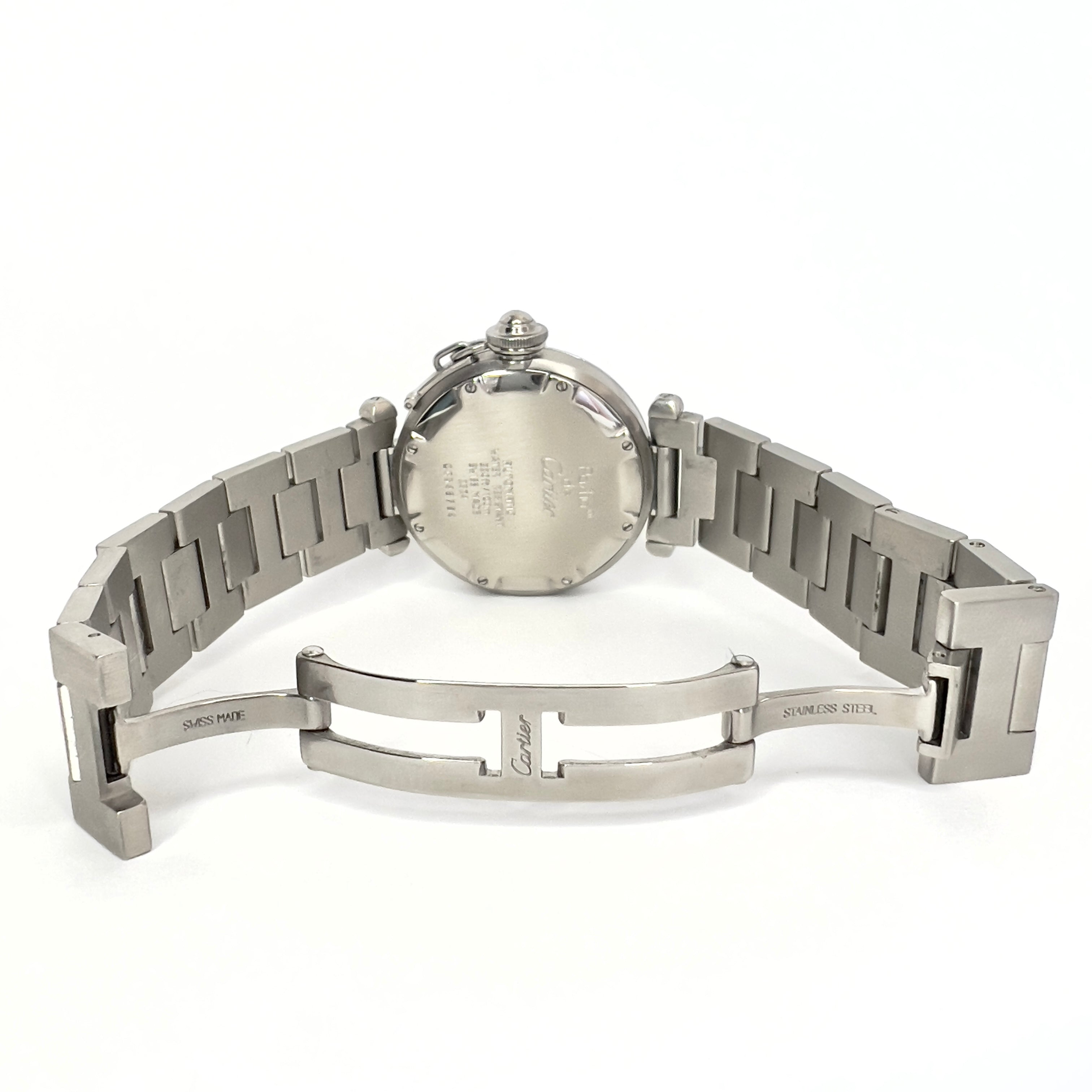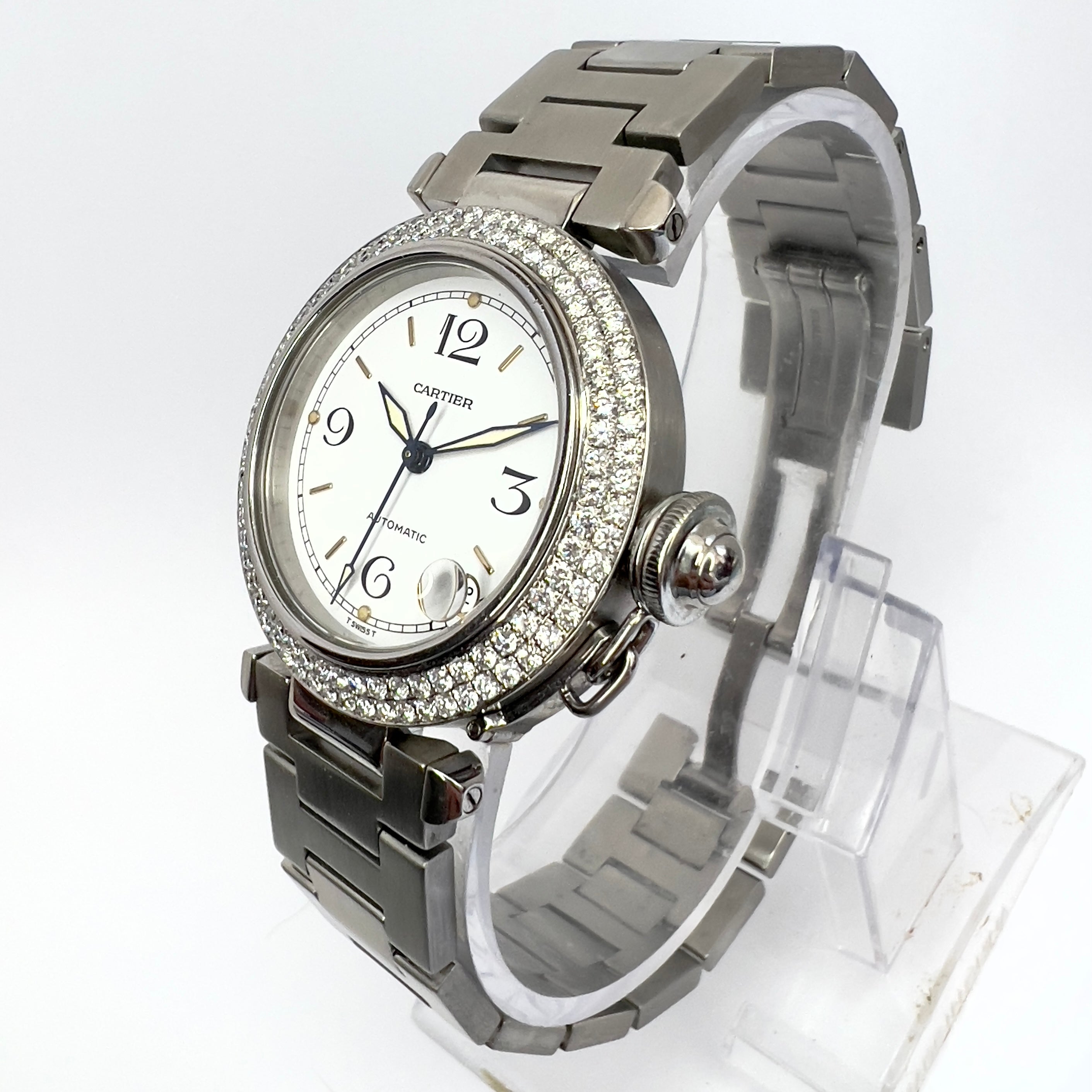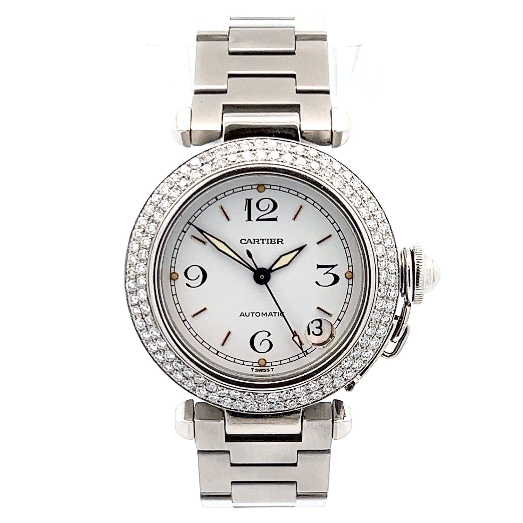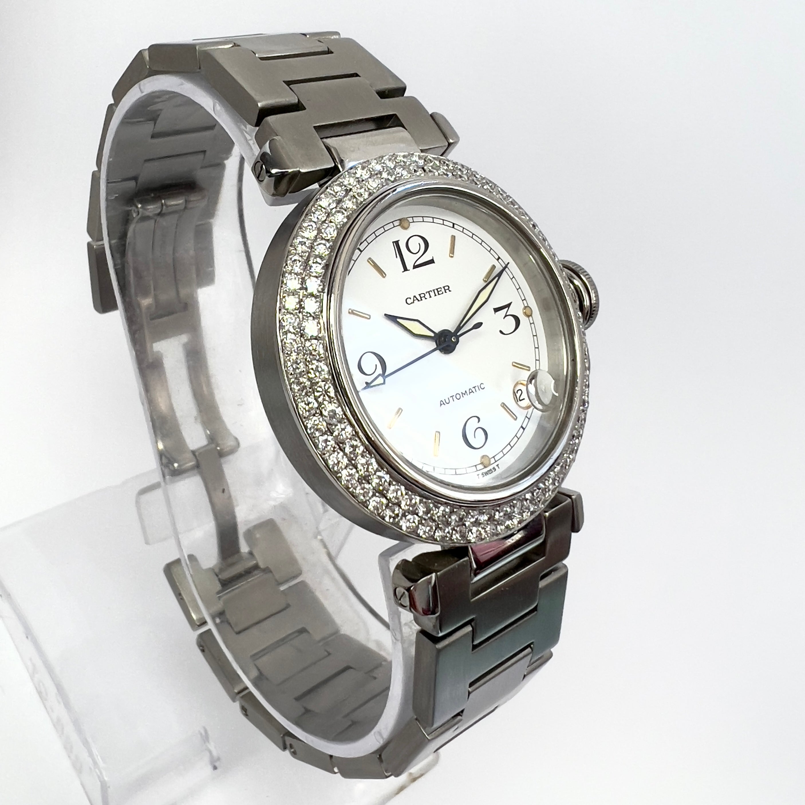 This Women's Cartier Pasha is a luxurious and stylish watch. The watch is made of Stainless Steel, offering a premium feel. The case measures 35 mm. The bracelet is made of Stainless Steel and is set with White. The dial is White, enhancing its visual appeal. Powered by an Automatic movement. Offered in Good condition, and comes with a seller's warranty of 60 months. Also available on custom order with additional options.