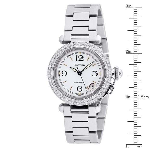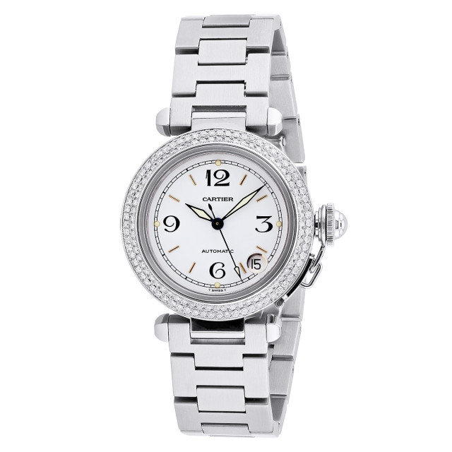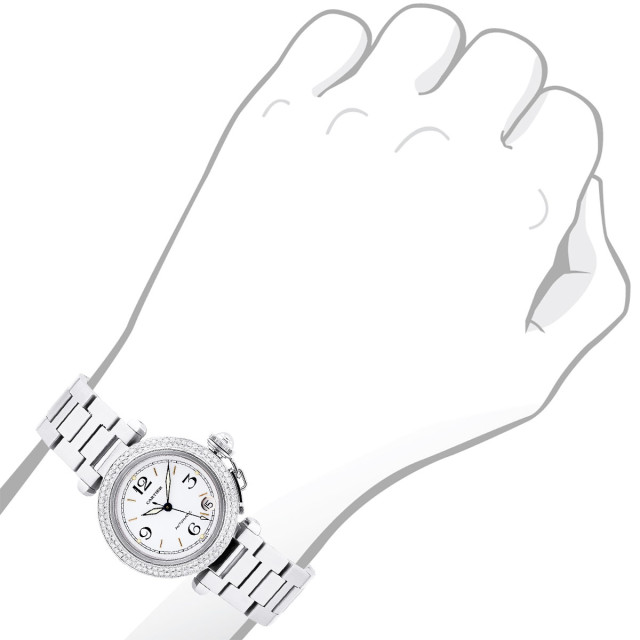 This Women's Cartier Pasha is a luxurious and stylish watch. The watch is made of Stainless Steel, offering a premium feel. The case measures 35 mm. The bracelet is made of Stainless Steel and is set with White. The dial is White, enhancing its visual appeal. Powered by an Automatic movement. Offered in Good condition, and comes with a seller's warranty of 60 months. Also available on custom order with additional options. Please note this Cartier watch is pre-owned, in excellent condition, the diamonds are high quality, natural diamonds, set by our master craftsmen, watch box might show signs of wear (watch itself will be in perfect condition), comes with a 5 year warranty from ItsHot.