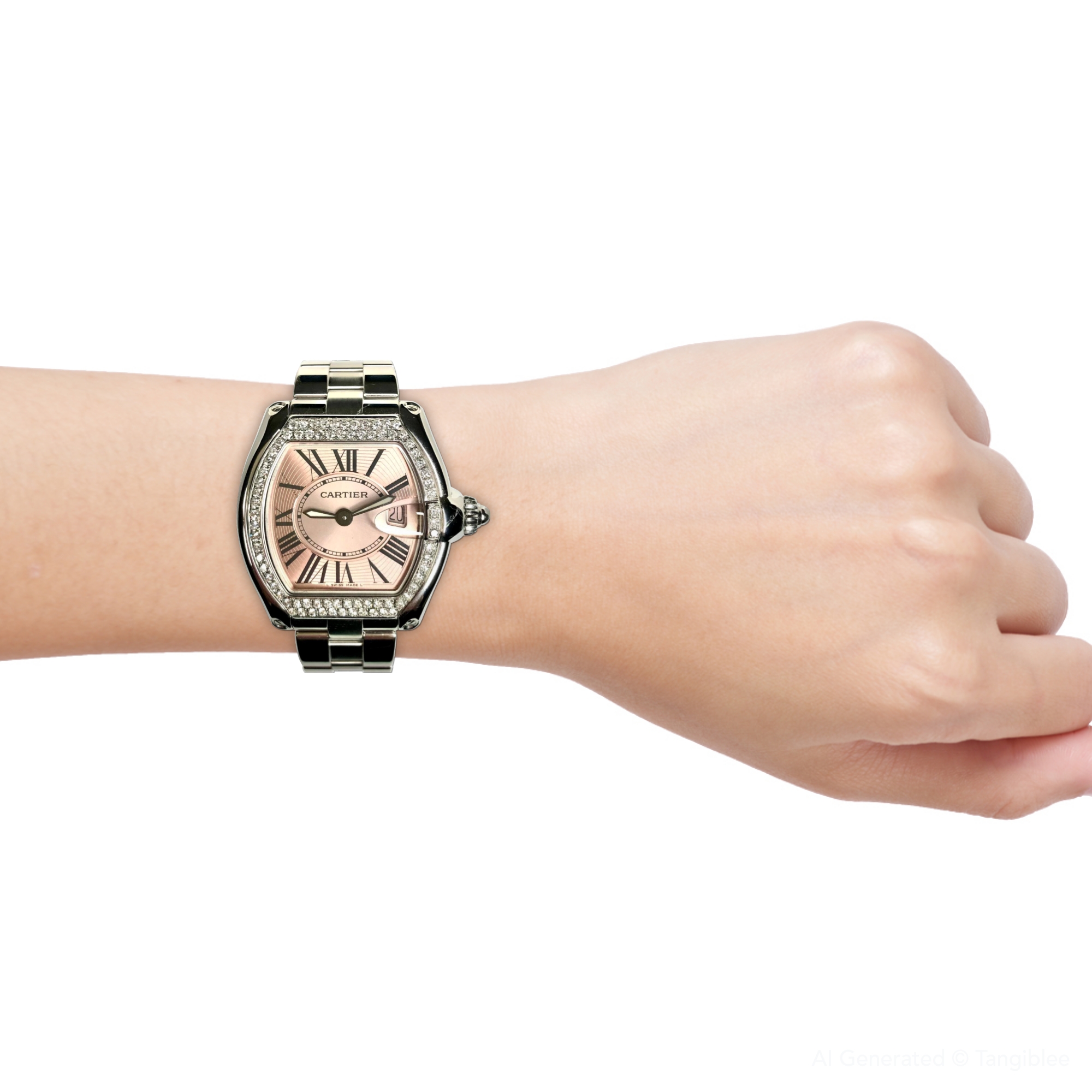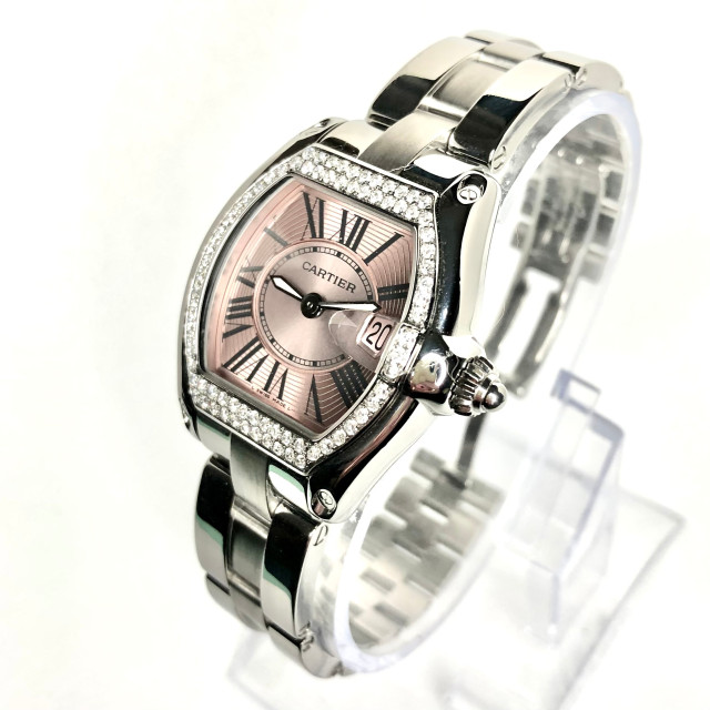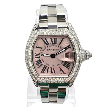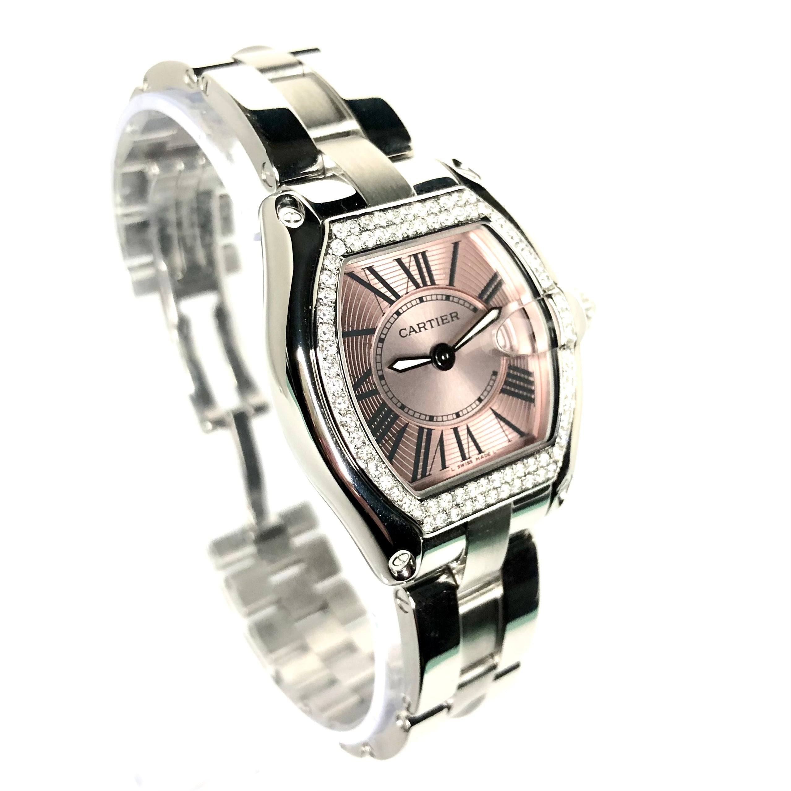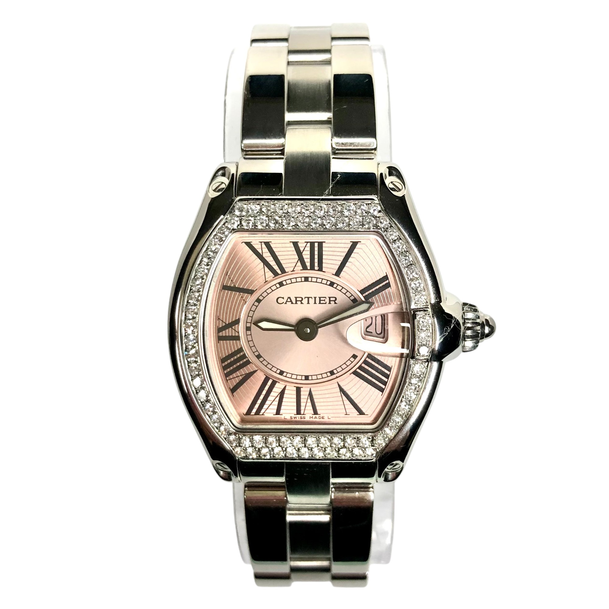 This Women's Cartier Roadster is a luxurious and stylish watch. The watch is made of Stainless Steel, offering a premium feel. The case measures 31 mm. The bracelet is made of Stainless Steel. The bezel is made of Stainless Steel and is set with White. The dial is Pink, enhancing its visual appeal. Powered by a Quartz movement, the watch includes functions such as Date Indicator. Offered in Good condition, and comes with a seller's warranty of 60 months. Also available on custom order with additional options.