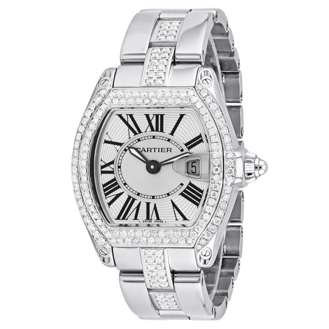This Women's Cartier Roadster is a luxurious and stylish watch. The watch is made of Stainless Steel, offering a premium feel. The case measures 31 mm. The bracelet is made of Stainless Steel. The bezel is made of Stainless Steel and is set with White. The dial is Silver, enhancing its visual appeal. Powered by a Quartz movement, the watch includes functions such as Date Indicator. Offered in Good condition, and comes with a seller's warranty of 60 months. Also available on custom order with additional options.