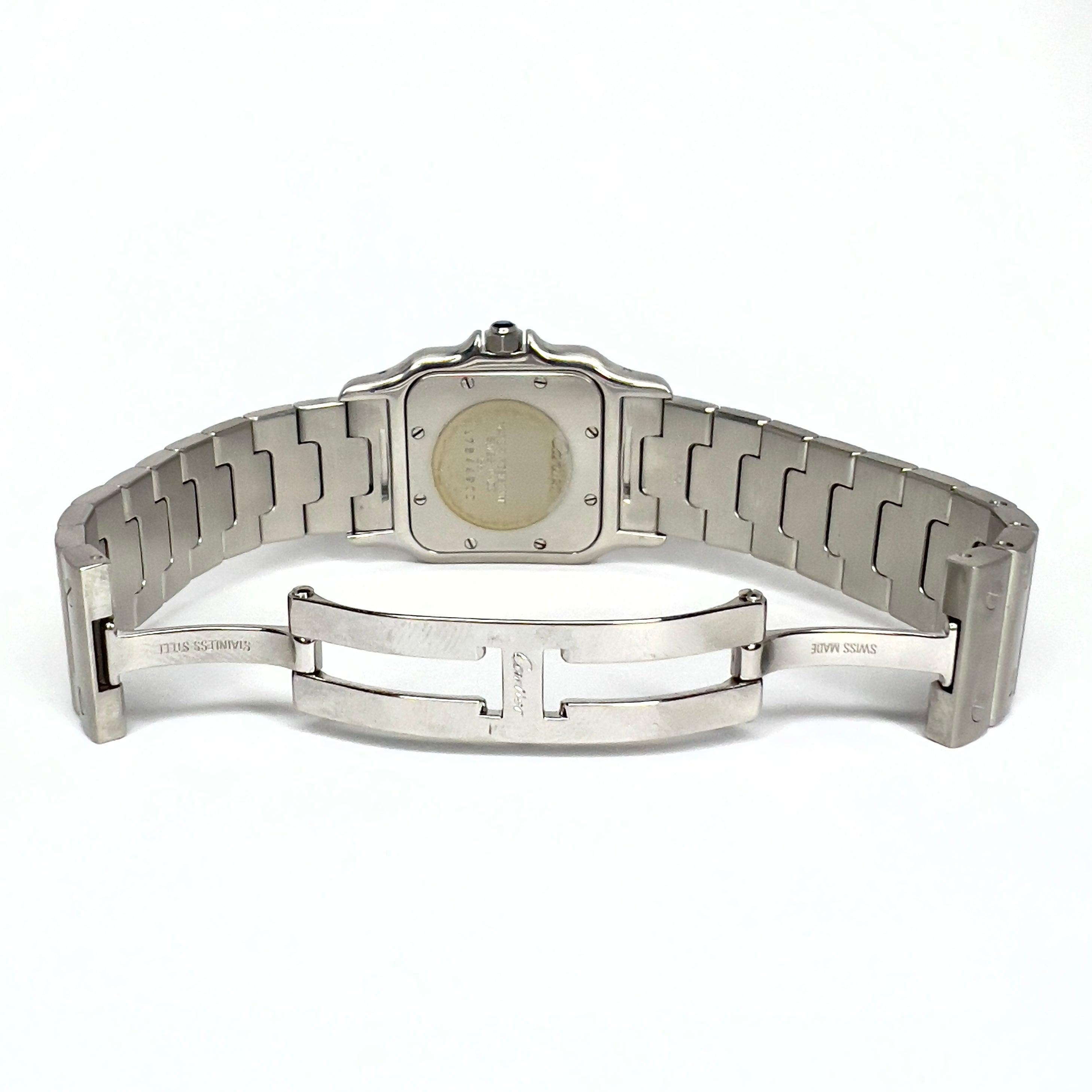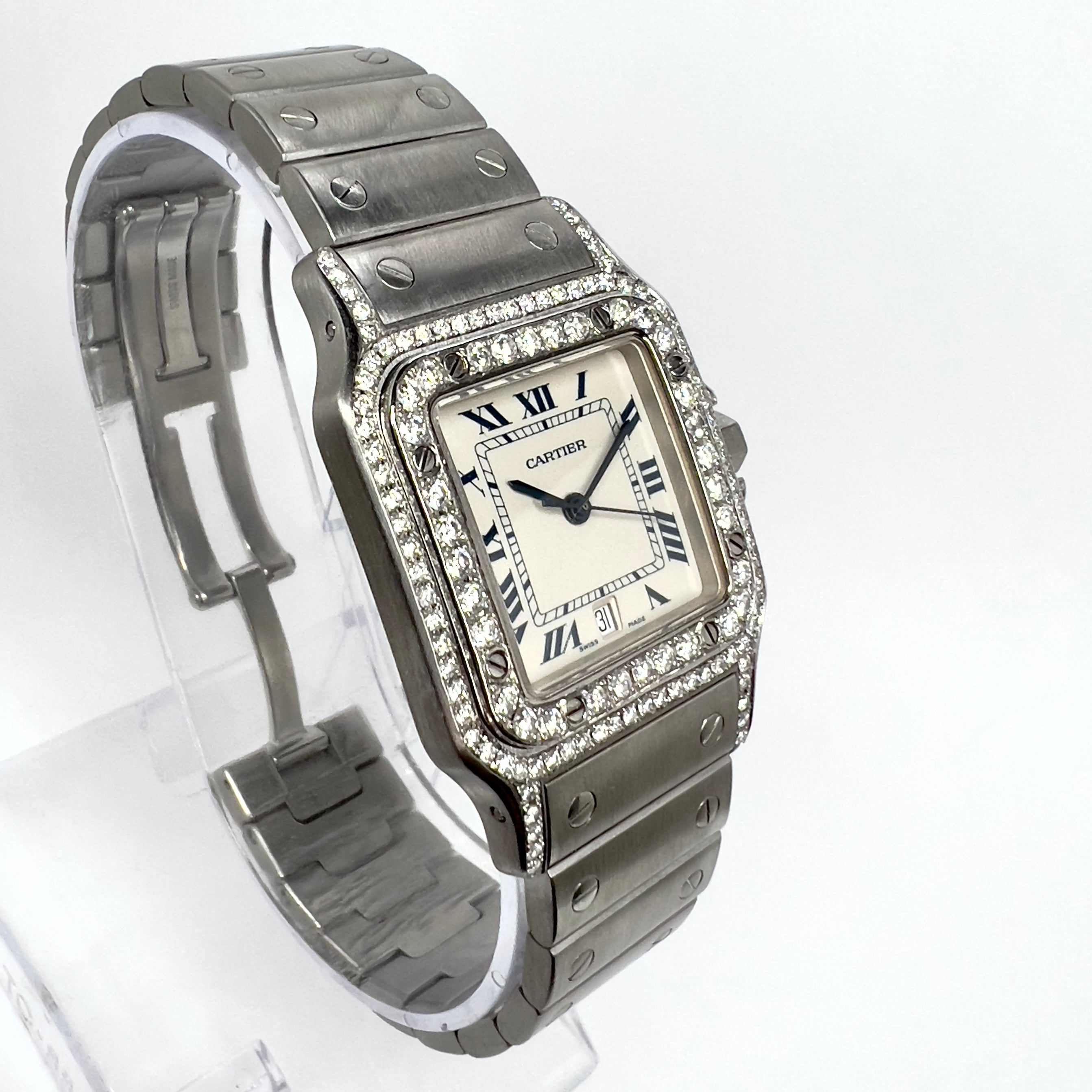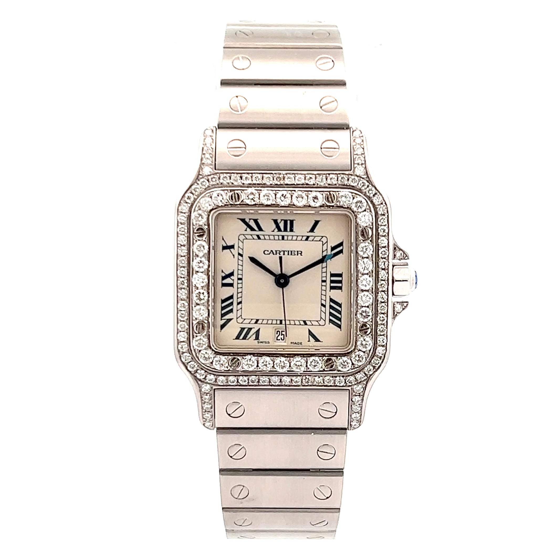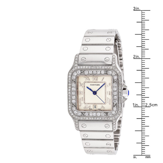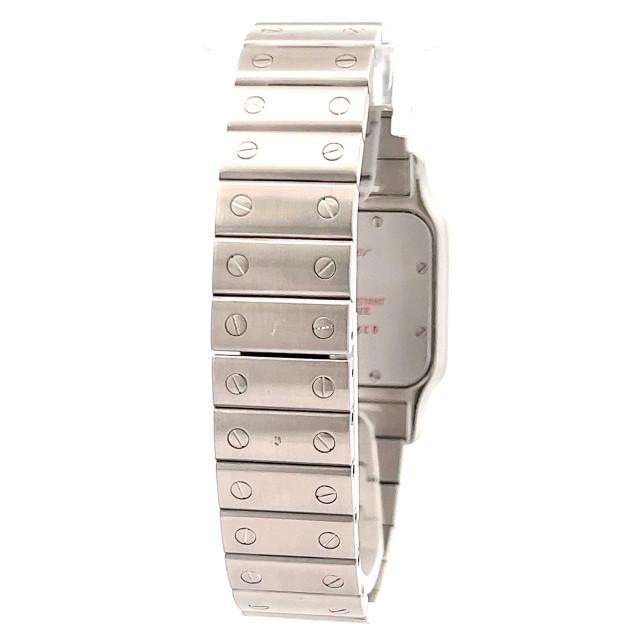 This Women's Cartier Santos de Cartier Galbee is a luxurious and stylish watch. The watch is made of Stainless Steel, offering a premium feel. The case measures 29 mm. The bracelet is made of Stainless Steel and is set with White. The dial is White, enhancing its visual appeal. Powered by a Quartz movement, the watch includes functions such as Date Indicator. Offered in Good condition, and comes with a seller's warranty of 60 months. Also available on custom order with additional options.