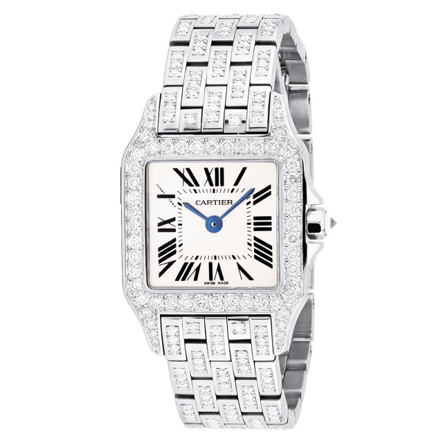 This Women's Cartier Santos Demoiselle is a luxurious and stylish watch. The watch is made of Stainless Steel, offering a premium feel. The case measures 26 mm. The bracelet is made of Stainless Steel and is set with White. The dial is Cream, enhancing its visual appeal. Powered by a Quartz movement. Offered in Good condition, and comes with a seller's warranty of 60 months. Also available on custom order with additional options. Please note this Cartier watch is pre-owned, in excellent condition, the diamonds are high quality, natural diamonds, set by our master craftsmen, watch box might show signs of wear (watch itself will be in perfect condition), comes with a 5 year warranty from ItsHot.