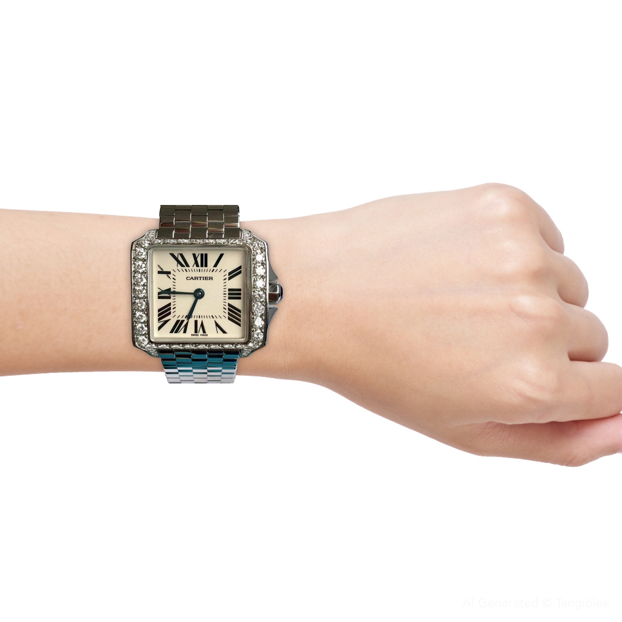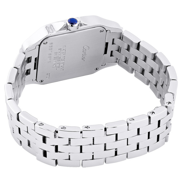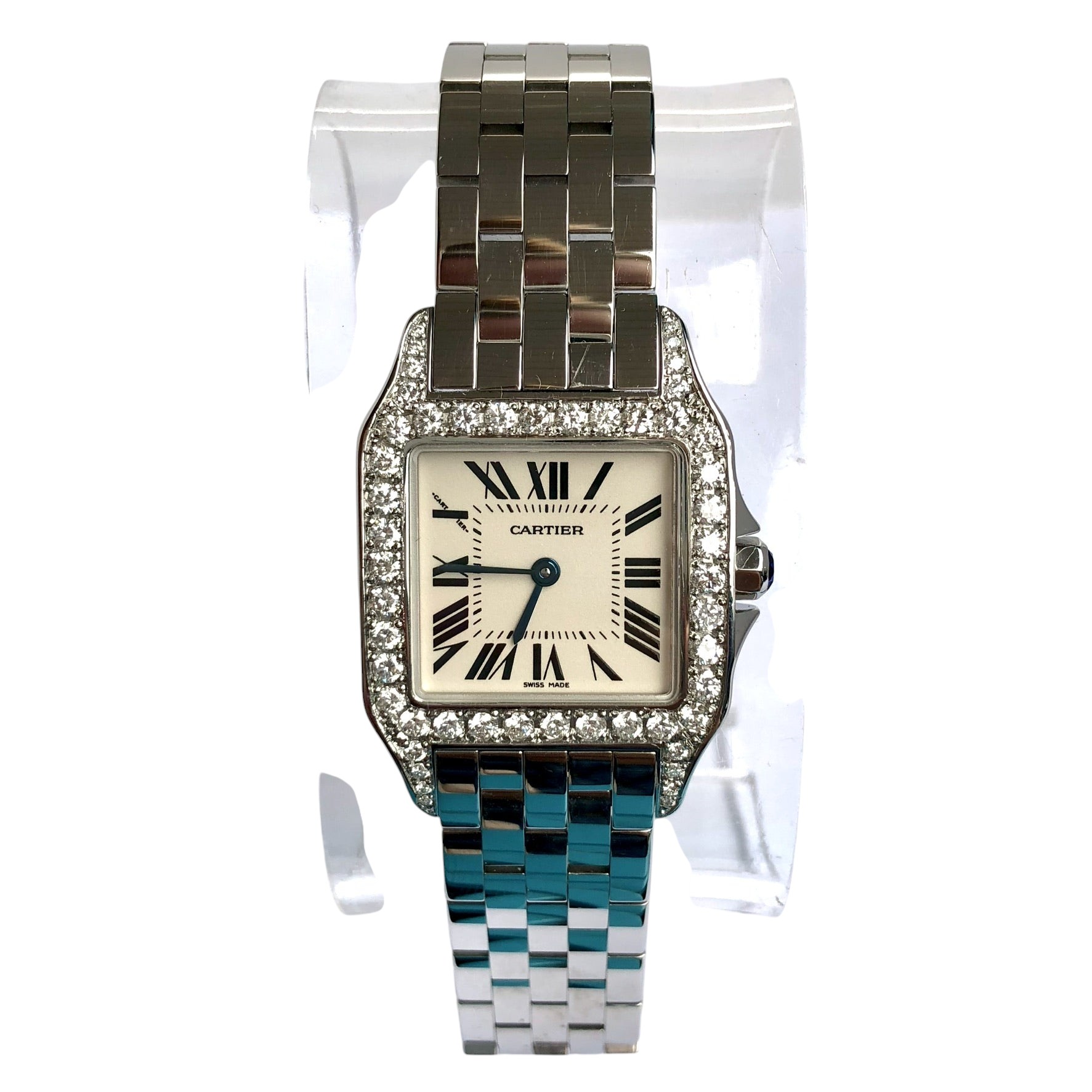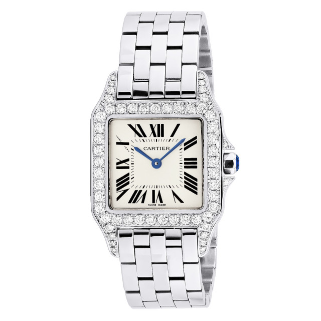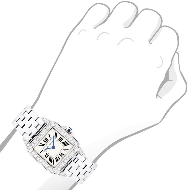 This Women's Cartier Santos Demoiselle is a luxurious and stylish watch. The watch is made of Stainless Steel, offering a premium feel. The case measures 26 mm. The bracelet is made of Stainless Steel and is set with White. The dial is Cream, enhancing its visual appeal. Powered by a Quartz movement. Offered in Good condition, and comes with a seller's warranty of 60 months. Also available on custom order with additional options.