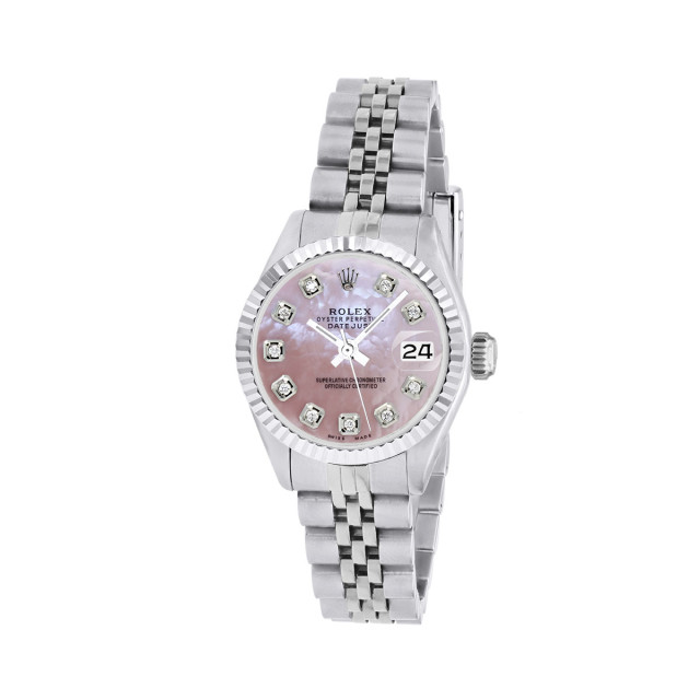 This Women's Rolex Oyster Perpetual Datejust is a luxurious and stylish watch. It features a White color scheme, adding sophistication to its design. The watch is made of Stainless Steel, offering a premium feel. The case measures 26 mm. The bracelet is made of White Stainless Steel It features a Jubilee style bracelet for a comfortable fit. The bezel is made of White Stainless Steel. The dial is Pink, enhancing its visual appeal. Powered by an Automatic movement, the watch includes functions such as Date Indicator. Offered in Good condition, and comes with a seller's warranty of 60 months. Also available on custom order with additional options. These pre-owned Rolex watches are authentic Rolex watches with genuine diamonds, in excellent condition, they are checked for authenticity and basic water resistance. Watches will withstand an occasional rain just fine, but they are not diver's watches and should not be worn in shower or while swimming.