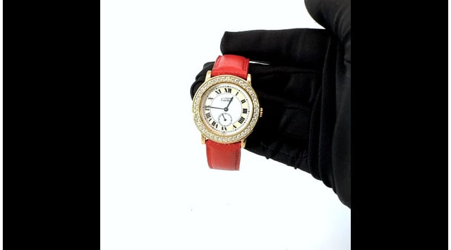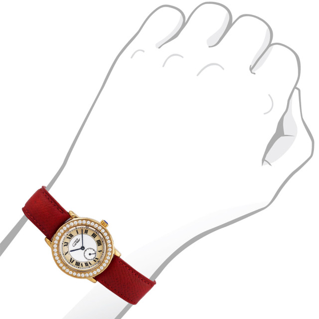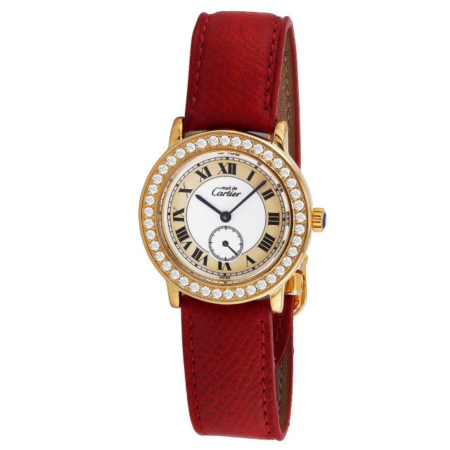 This Women's Cartier Must de Cartier Ronde is a luxurious and stylish watch. The watch is made of Vermeil, offering a premium feel. The case measures 32 mm. The bracelet is made of Red Genuine Leather. The bezel is made of Yellow Sterling Silver and is set with White Diamonds. The dial is White, enhancing its visual appeal. Powered by a Quartz movement. Offered in Good condition, and comes with a seller's warranty of 60 months. Also available on custom order with additional options.