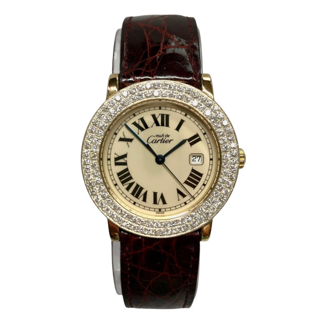 This Women's Cartier Must de Cartier Ronde is a luxurious and stylish watch. The watch is made of Vermeil, offering a premium feel. The case measures 32 mm. The bracelet is made of Burgundy Genuine Leather. The bezel is made of Sterling Silver and is set with White. The dial is Cream, enhancing its visual appeal. Powered by a Quartz movement, the watch includes functions such as Date Indicator. Offered in Good condition, and comes with a seller's warranty of 60 months. Also available on custom order with additional options.