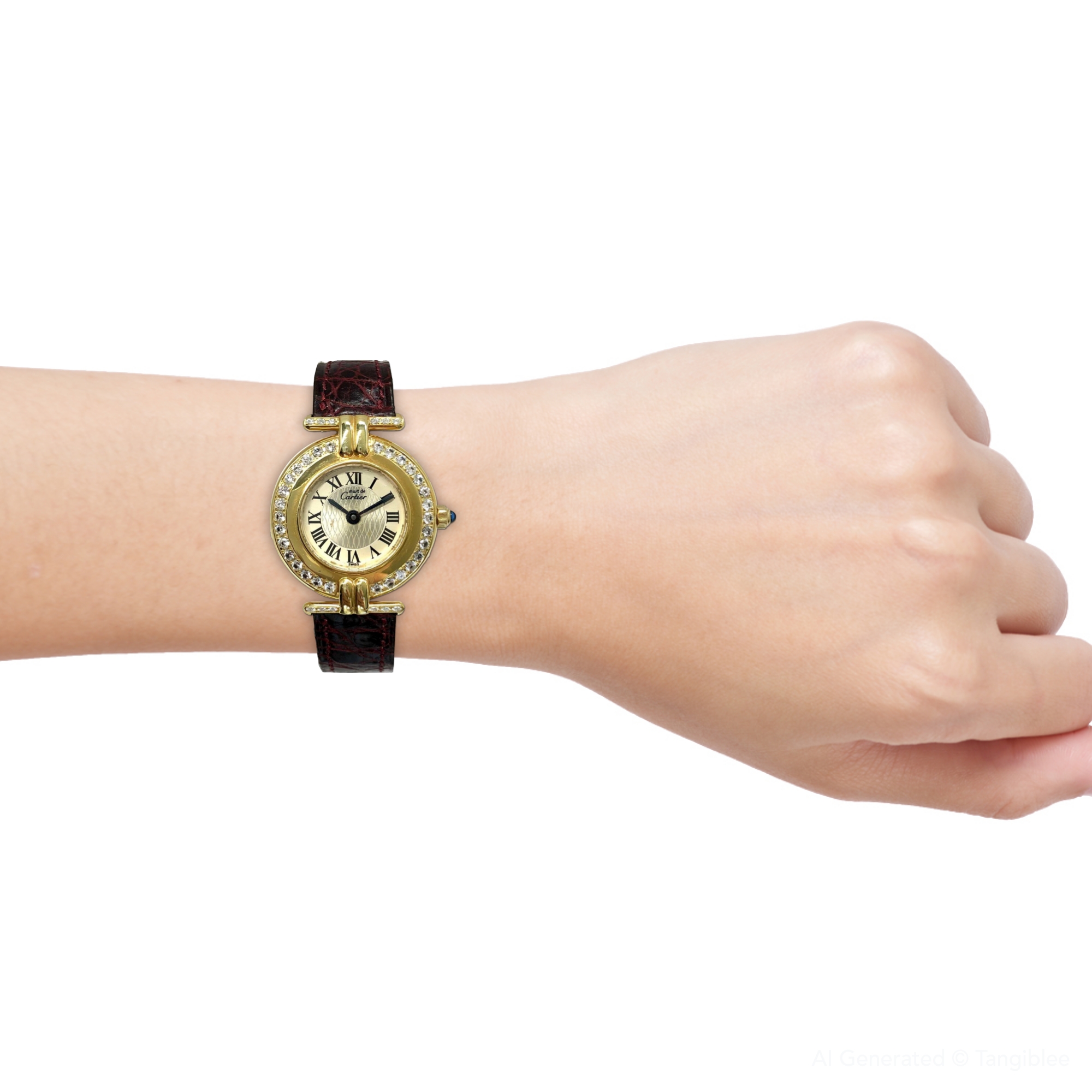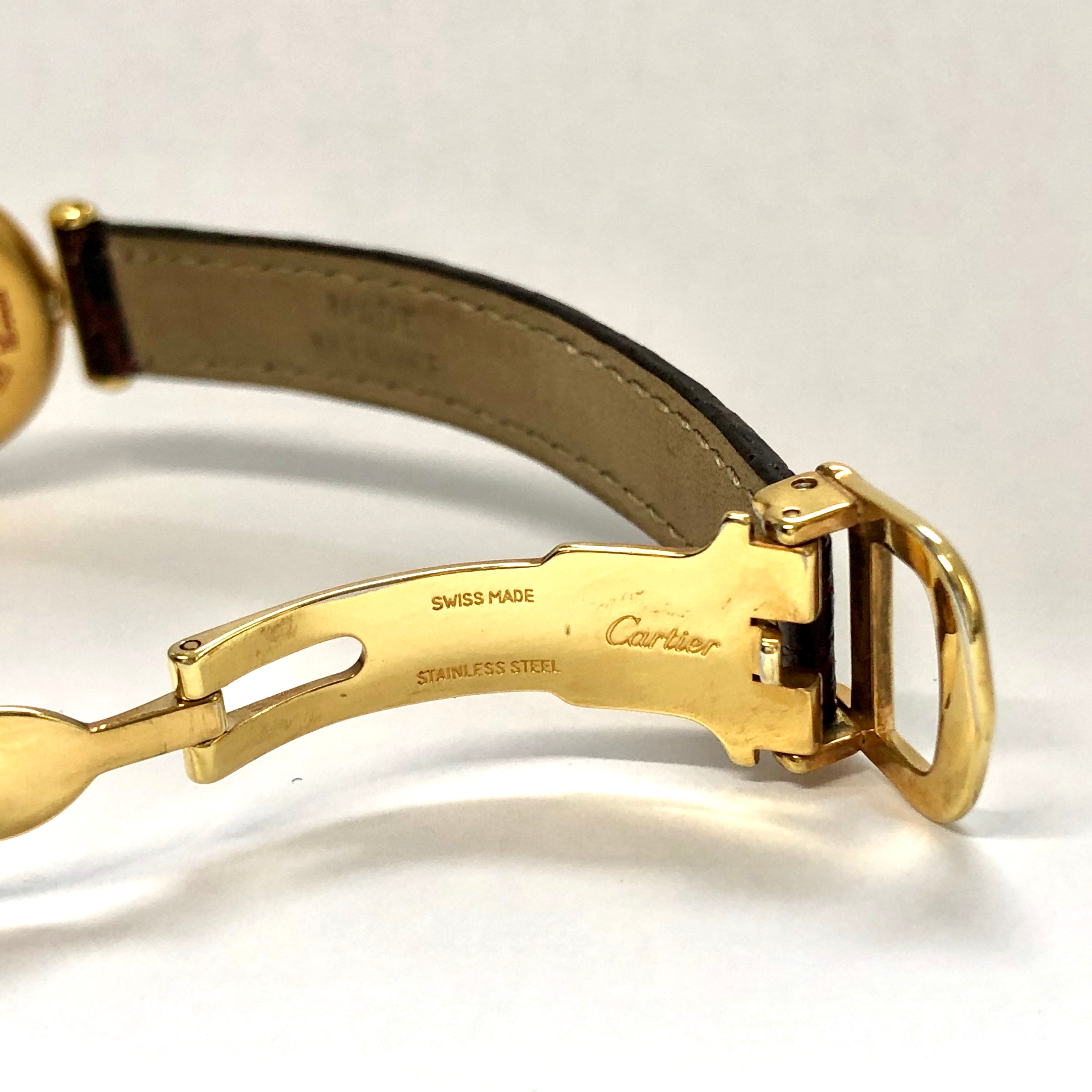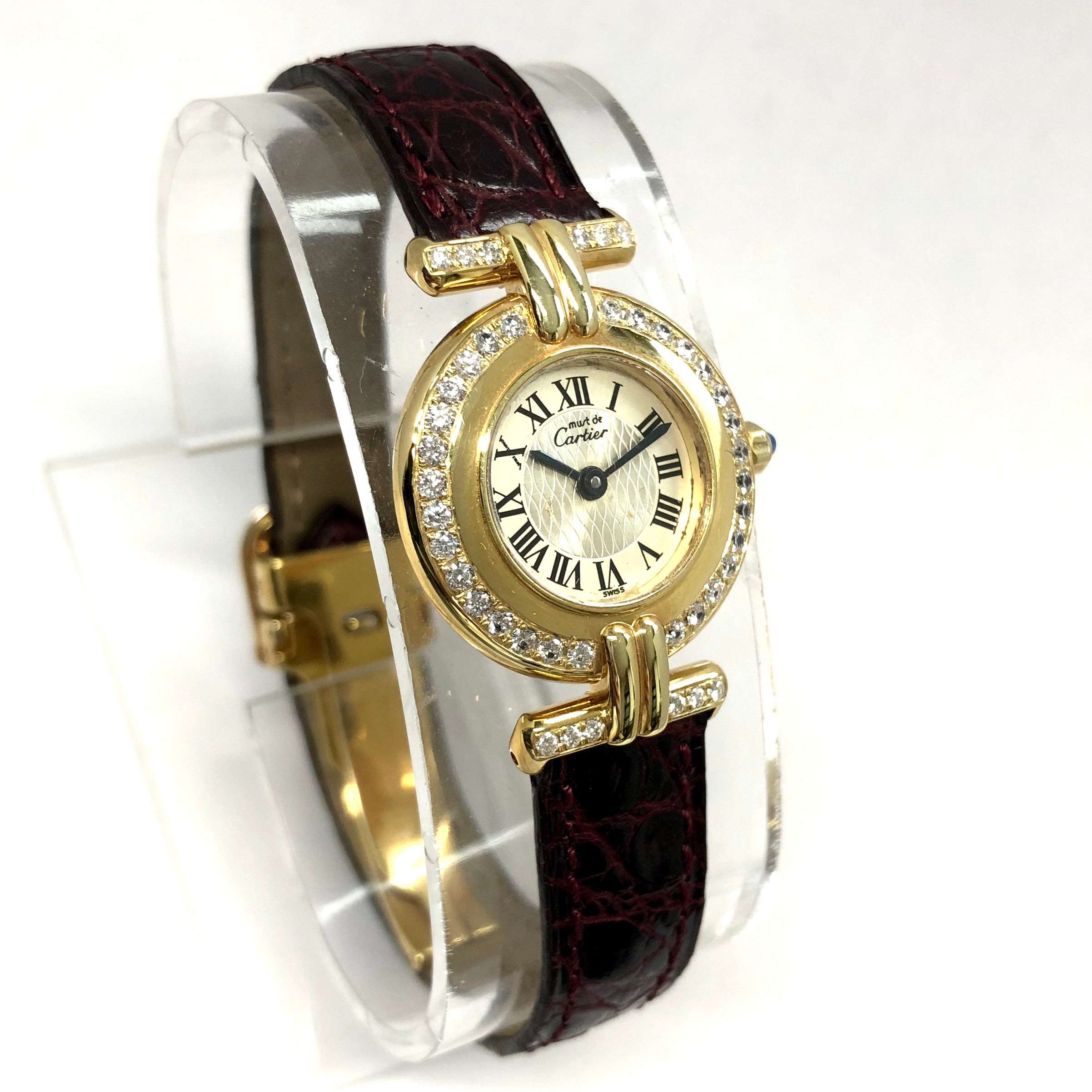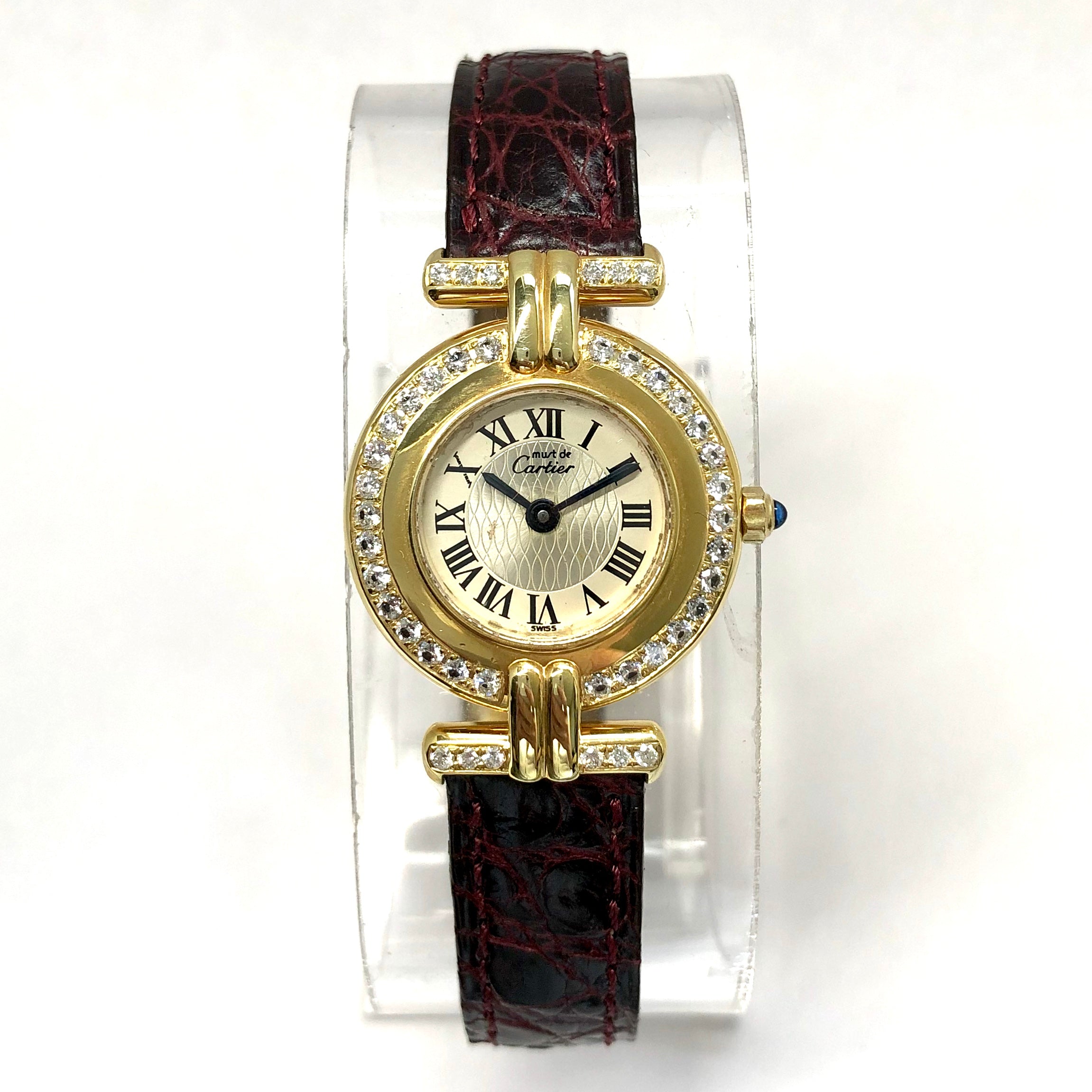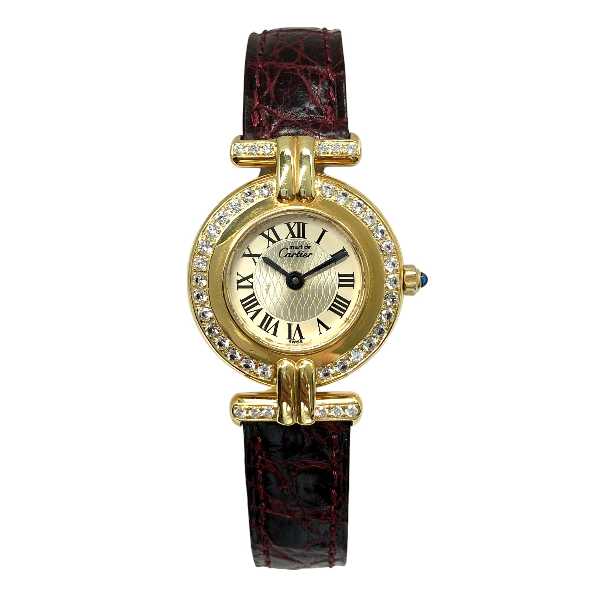 This Women's Cartier Vermeil Must Colisee is a luxurious and stylish watch. It features a Yellow color scheme, adding sophistication to its design. The watch is made of Vermeil, offering a premium feel. The case measures 24 mm. The bracelet is made of Burgundy Genuine Leather and is set with White. The dial is Silver, enhancing its visual appeal. Powered by a Quartz movement. Offered in Good condition, and comes with a seller's warranty of 60 months. Also available on custom order with additional options.